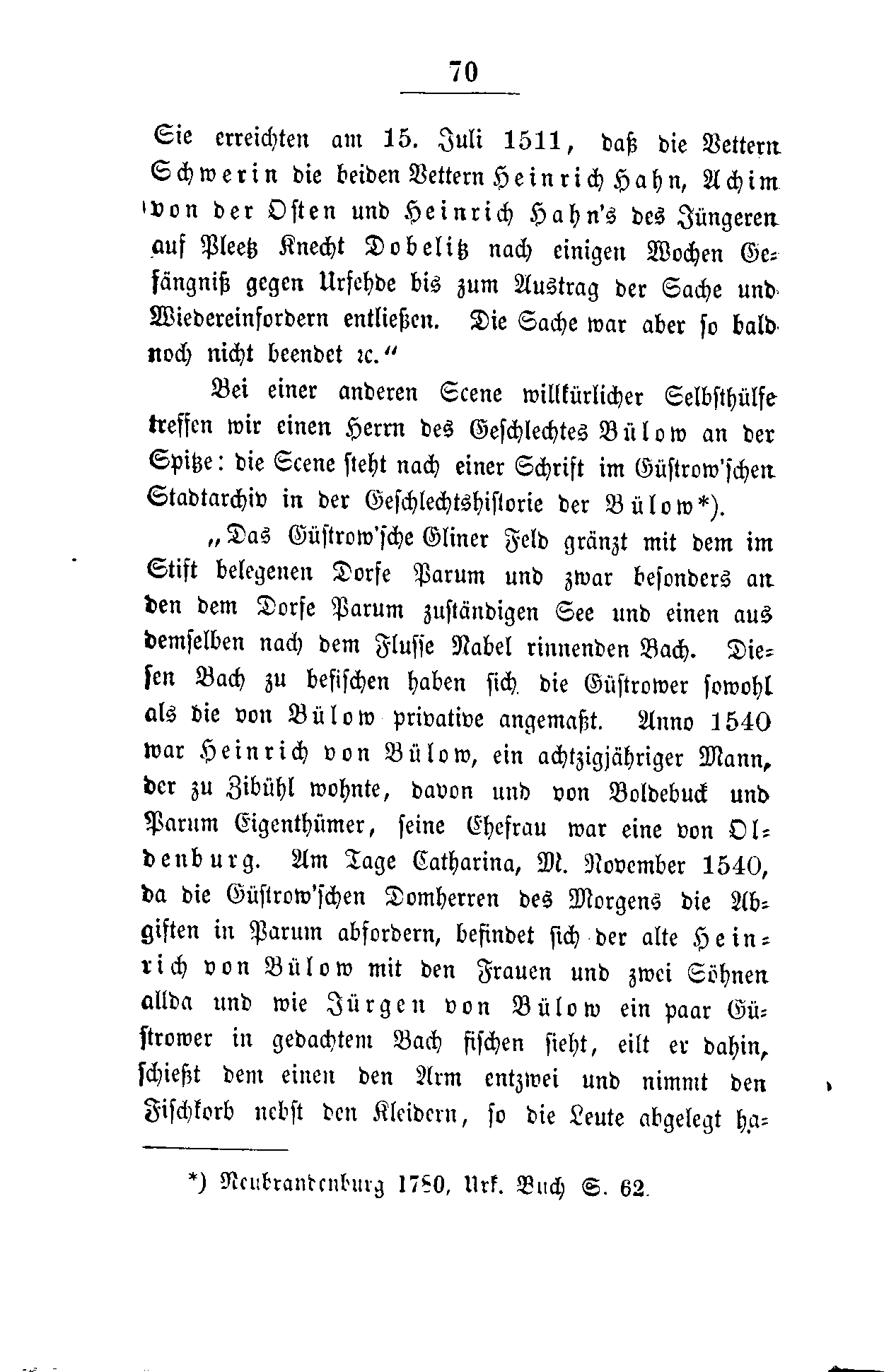 „Das Güstrow'sche Gliner Feld gränzt mit dem im Stift belegenen Dorfe Parum und zwar besonders an den dem Dorfe Parum zuständigen See und einen aus demselben nach dem Flusse Nabel rinnenden Bach. Diesen Bach zu befischen haben sich, die Güstrower sowohl als die von Bülow privative angemaßt. Anno 1540 war Heinrich von Bülow, ein achtzigjähriger Mann, der zu Zibühl wohnte, davon und von Boldebuck und Parum Eigenthümer, seine Ehefrau war eine von Oldenburg. Am Tage Catharina, M. November 1540, da die Güstrow'schen Domherren des Morgens die Abgiften in Parum abfordern, befindet sich der alte Heinrich von Bülow mit den Frauen und zwei Söhnen allda und wie Jürgen von Bülow ein paar Güstrower in gedachtem Bach fischen sieht, eilt er dahin, schießt dem einen den Arm entzwei und nimmt den Fischkorb nebst den Kleidern, so die Leute abgelegt ha-