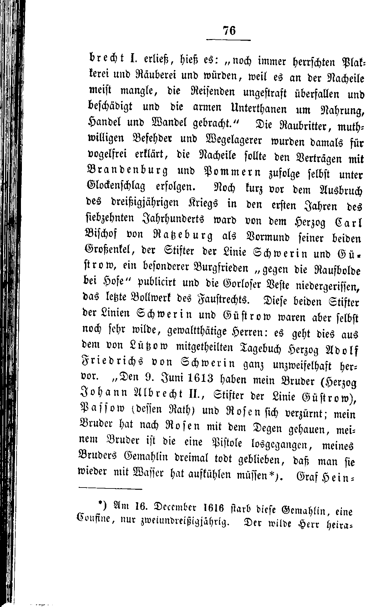 brecht I, erließ, hieß es: „noch immer herrschten Plackerei und Räuberei und würden, weil es an der Nacheile meist mangle, die Reisenden ungestraft überfallen und beschädigt und die armen Unterthanen um Nahrung, Handel und Wandel gebracht." Die Raubritter, muthwilligen Befehder und Wegelagerer wurden damals für vogelfrei erklärt, die Nacheile sollte den Verträgen mit Brandenburg und Pommern zufolge selbst unter Glockenschlag erfolgen. Noch kurz vor dem Ausbruch des dreißigjährigen Kriegs in den ersten Jahren des siebzehnten Jahrhunderts ward von dem Herzog Carl Bischof von Ratzeburg als Vormund seiner beiden Großenkel, der Stifter der Linie Schwerin und Güstrow, ein besonderer Burgfrieden „gegen die Raufbolde bei Hofe" publicirt und die Gorloser Veste niedergerissen, das letzte Bollwerk des Faustrechts. Diese beiden Stifter der Linien Schwerin und Güstrow waren aber selbst noch sehr wilde, gewaltthätige Herren: es geht dies aus dem von Lützow mitgetheilten Tagebuch Herzog Adolf Friedrichs von Schwerin ganz unzweifelhaft hervor. „Den 9. Juni 1613 haben mein Bruder (Herzog Johann Albrecht II., Stifter der Linie Güstrow), Passow (dessen Rath) und Rosen sich verzürnt; mein Bruder hat nach Rosen mit dem Degen gehauen, meinem Bruder ist die eine Pistole losgegangen, meines Bruders Gemahlin dreimal todt geblieben, daß man sie wieder mit Wasser hat aufkühlen müssen[1]