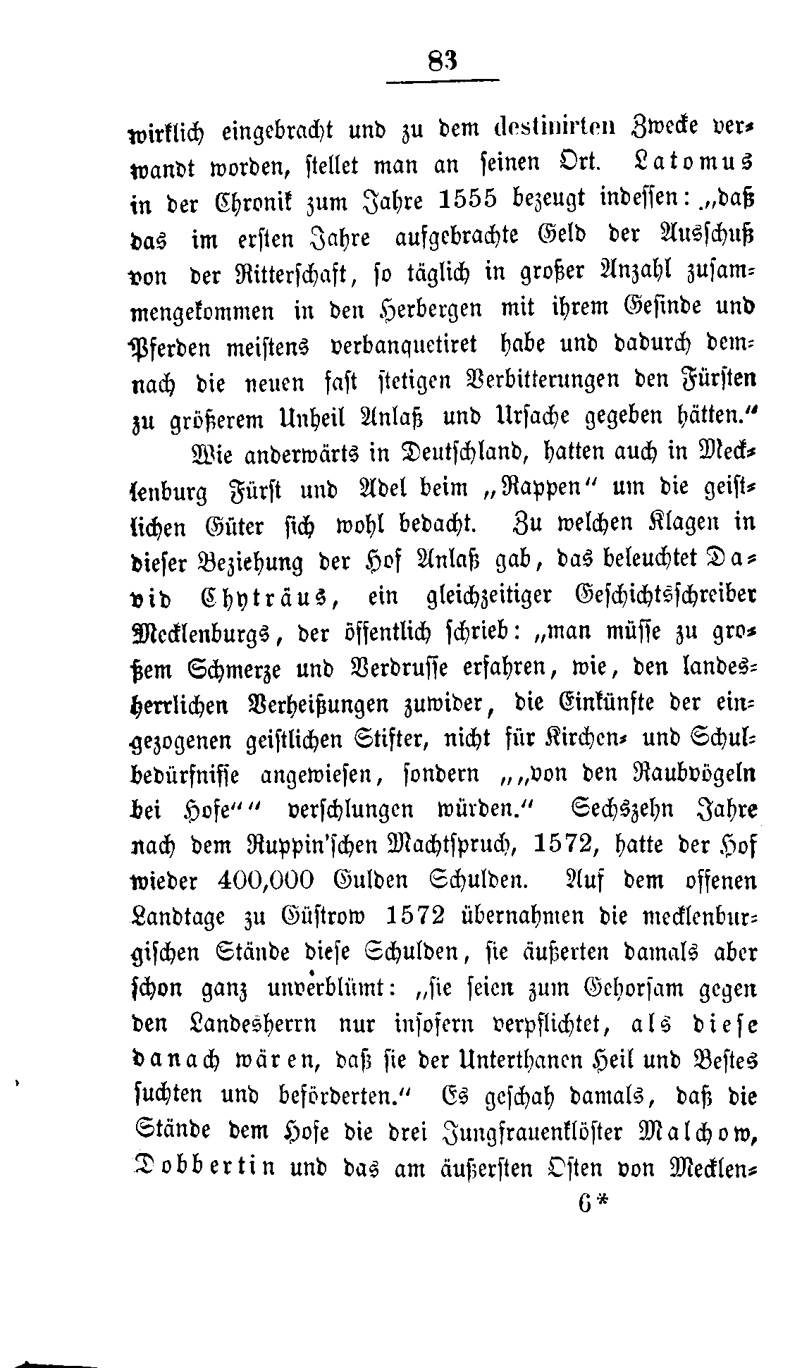 WIe anderwärts in Deutschland, hatten auch in Mecklenburg FÜrst und Adel beim „Rappen“ um die geistlichen Güter sich wohl bedacht. Zu welchen klagen in dieser Beziehung der Hof Anlaß gab, das beleuchtet David Chyträus, ein gleichzeitiger Geschichtsschreiber Mecklenburgs, der öffentlich schrieb: „man müsse zu großem Schmerze und Verdrusse erfahren, wie, den landesherrlichen Verheißungen zuwider, die Einkünfte der eingezogenen geistlichen Stifter, nicht für Kirchen- und Schulbedürfnisse angewiesen, sondern „„von den Raubvögeln bei Hofe““ verschlungen würden.“ Sechszehn Jahre nach dem Ruppin'schen Machtspruch, 1572, hatte der Hof wieder 400,000 Gulden Schulden. Auf dem offenen Landtage zu Güstrow 1572 übernahmen die mecklenburgischen Stände diese Schulden, sie äußerten damals aber schon ganz unverblümt: „sie seien zum Gehorsam gegen den Landesherrn nur insofern verpflichtet, als diese danach wären, daß sie der Unterthanen Heil und Bestes suchten und beförderten.“ Es geschah damals, daß die Stände dem Hofe die drei Jungfrauenklöster Malchow, Dobbertin und das am äußersten Osten von Mecklen-