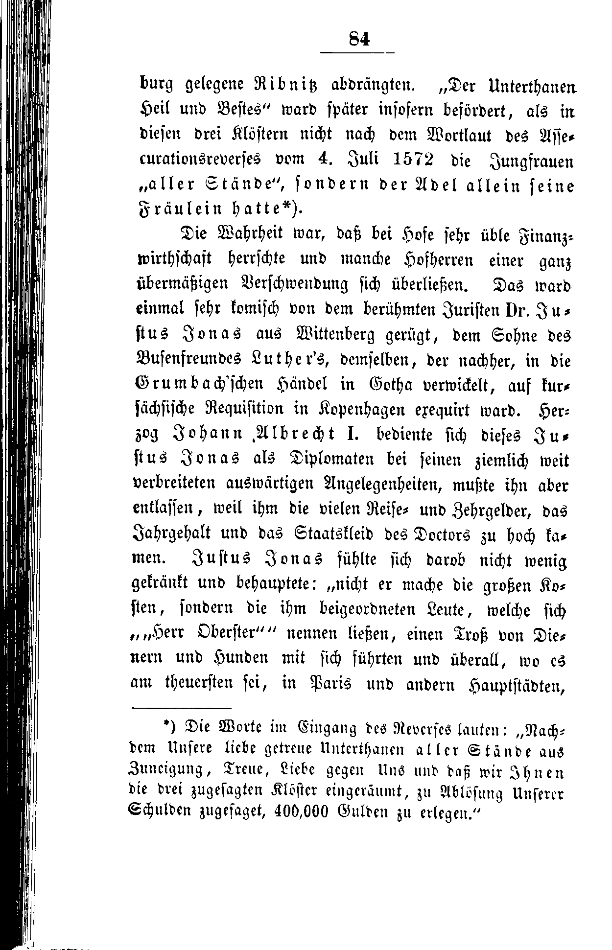 Die Wahrheit war, daß bei Hofe sehr üble Finanzwirthschaft herrschte und manche Hofherren einer ganz übermäßigen Verschwendung sich überließen. Das ward einmal sehr komisch von dem berühmten Juristen Dr. Justus Jonas aus Wittenberg gerügt, dem Sohne des Busenfreundes Luther's, demselben, der nachher, in die Grumbach'schen Händel in Gotha verwickelt, auf kursächsische Requisition in Kopenhagen exequirt ward. Herzog Johann Albrecht I. bediente sich dieses Justus Jonas als Diplomaten bei seinen ziemlich weit verbreiteten auswärtigen Angelegenheiten, mußte ihn aber entlassen, weil ihm die vielen Reise- und Zehrgelder, das Jahrgehalt und das Staatskleid des Doctors zu hoch kamen. Justus Jonas fühlte sich darob nicht wenig gekränkt und behauptete: „nicht er mache die großen Kosten, sondern die ihm beigeordneten Leute, welche sich „„Herr Oberster““ nennen ließen, einen Troß von Dienern und Hunden mit sich führten und überall, wo es am theuersten sei, in Paris und andern Hauptstädten,