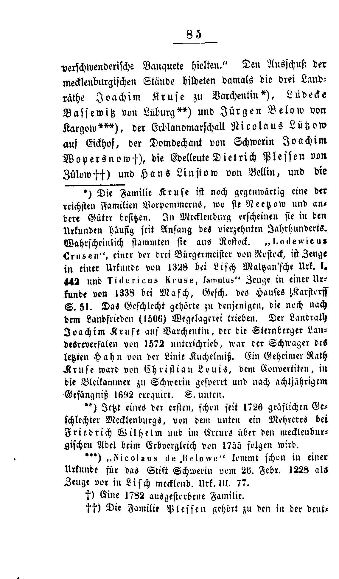 - ↑ Die Familie Kruse ist noch gegenwärtig eine der reichsten Familien Vorpommerns, wo sie Neetzow und andere Güter besitzen. In Mecklenburch erscheinen sie in den Urkunden Häufig seit Anfang des vierzehnten Jahrhunders. Wahrscheinlich stammten sie aus Rostock. „Lodewicus Crusen“, einer der drei Bürgermeister von Rostock, ist Zeuge in einer Urkunde von 1328 bei Lisch Maltzan'sche Urk. I.442 und „Tidericus Kruse, famulus“ Zeugein einer Urkunde von 1338 bei Masch, Gesch. des Hauses Karsterff S. 51. Das Geschlecht gehörte zu denjenigen, die noch nach dem Landfrieden (1506) Wegelagerei trieben. Der Landrath Joachim Kruse auf Varchentin, der die Sternberger Landesreversalen von 1572 unterschrieb, war der Schwager des letzten Hahn von der Linie Kuchelmiß. Ein Geheimer Rath Kruse ward von Christian Louis, dem Convertiten, in die Bleikammer zu Schwerin gesperrt und nach achtjährigem Gefängniß 1692 exequiert. S. unten.