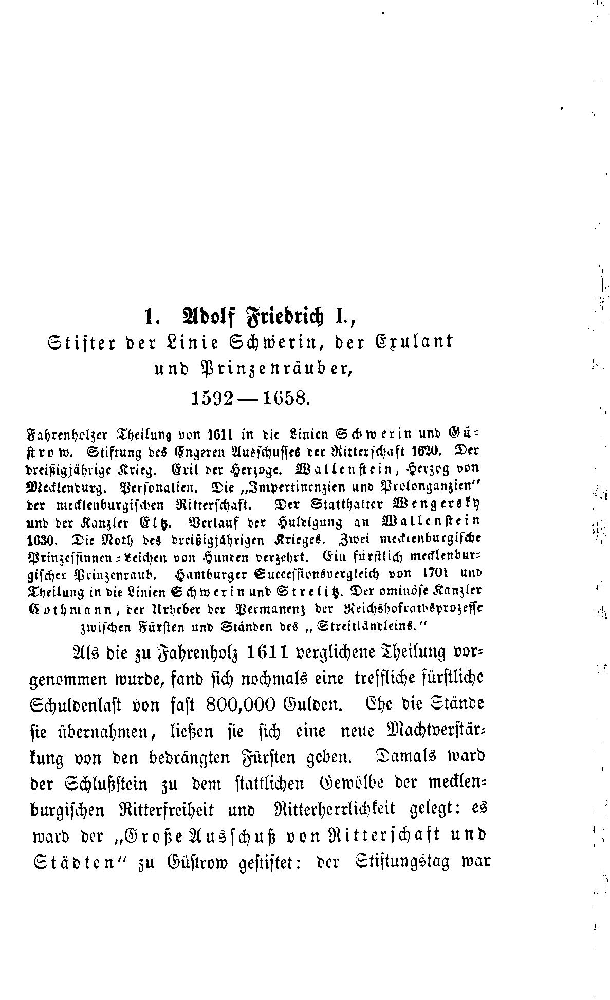 Fahrenholzer Theilung von 1611 in die Linien Schwerin und Güstrow. Stiftung des Engeren Ausschusses der Ritterschaft 1620. Der dreißighährige Krieg. Exil der Herzoge. Wallenstein, Herzog von Mecklenburg. Personalien. Die „Impertinenzien und Prolonganzien“ der mecklenburgischen Ritterschaft. Der Statthalter Wengersky und der Kanzler{{Sperrschrift|Eltz. Verlauf der Huldigung an Wallenstein 1630. Die Noth des dreißigjährigen Krieges. Zwei mecklenburgische PRinzessinnen-Zeichen von Hunden verzehrt. Ein fürstlich mecklenburgischer Prinzenraub. Hamburger Successionsvergleich von 1701 und Theilung in die Linien Schwerin und Strelitz. Der ominöse Kanzler Cothmann, der Urheber der Permanenz der Reichshofrathsprozesse zwischen Fürsten und Ständen des „Streitländleins.“