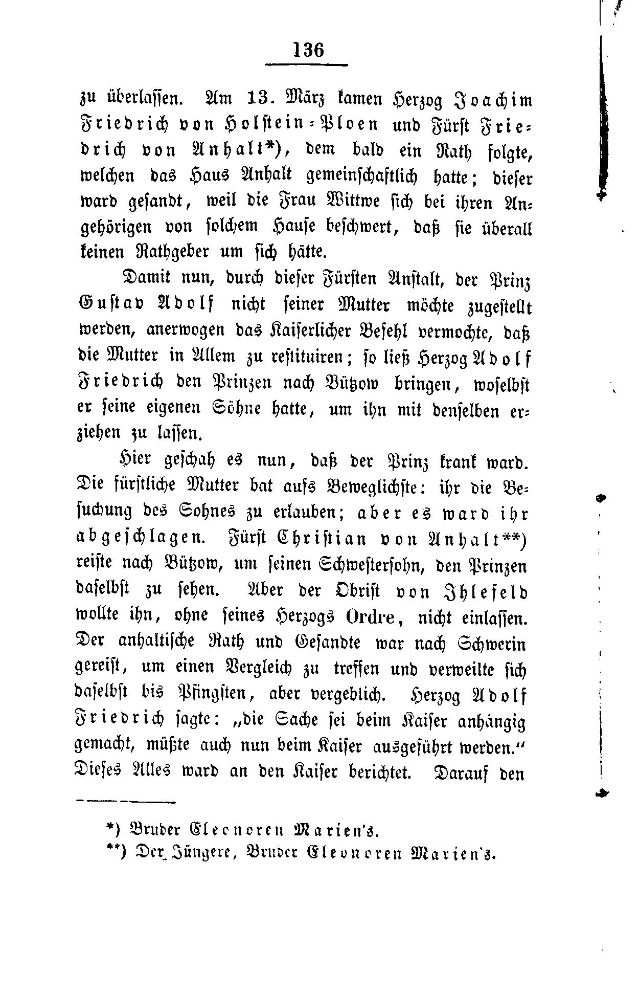 Hier geschah es nun, daß der Prinz krank ward. Die fürstliche Mutter bat aufs Beweglichste: ihr die Besuchung des Sohnes zu erlauben; aber es ward ihr abgeschlagen. Fürst Christian von Anhalt**) reiste nach Bützow, um seinen Schwestersohn, den Prinzen daselbst zu sehen. Aber der Obrist von Ihlefeld wollte ihn, ohne seines Herzogs Ordre, nicht einlassen. Der anhaltische Rath und Gesandte war nach Schwerin gereist, um einen Vergleich zu treffen und verweilte sich daselbst bis Pfingsten, aber vergeblich. Herzog Adolf Friedrich sagte: „die Sache sei beim Kaiser anhängig gemacht, müßte auch nun beim Kaiser ausgeführt werden." Dieses Alles ward an den Kaiser berichtet. Darauf den