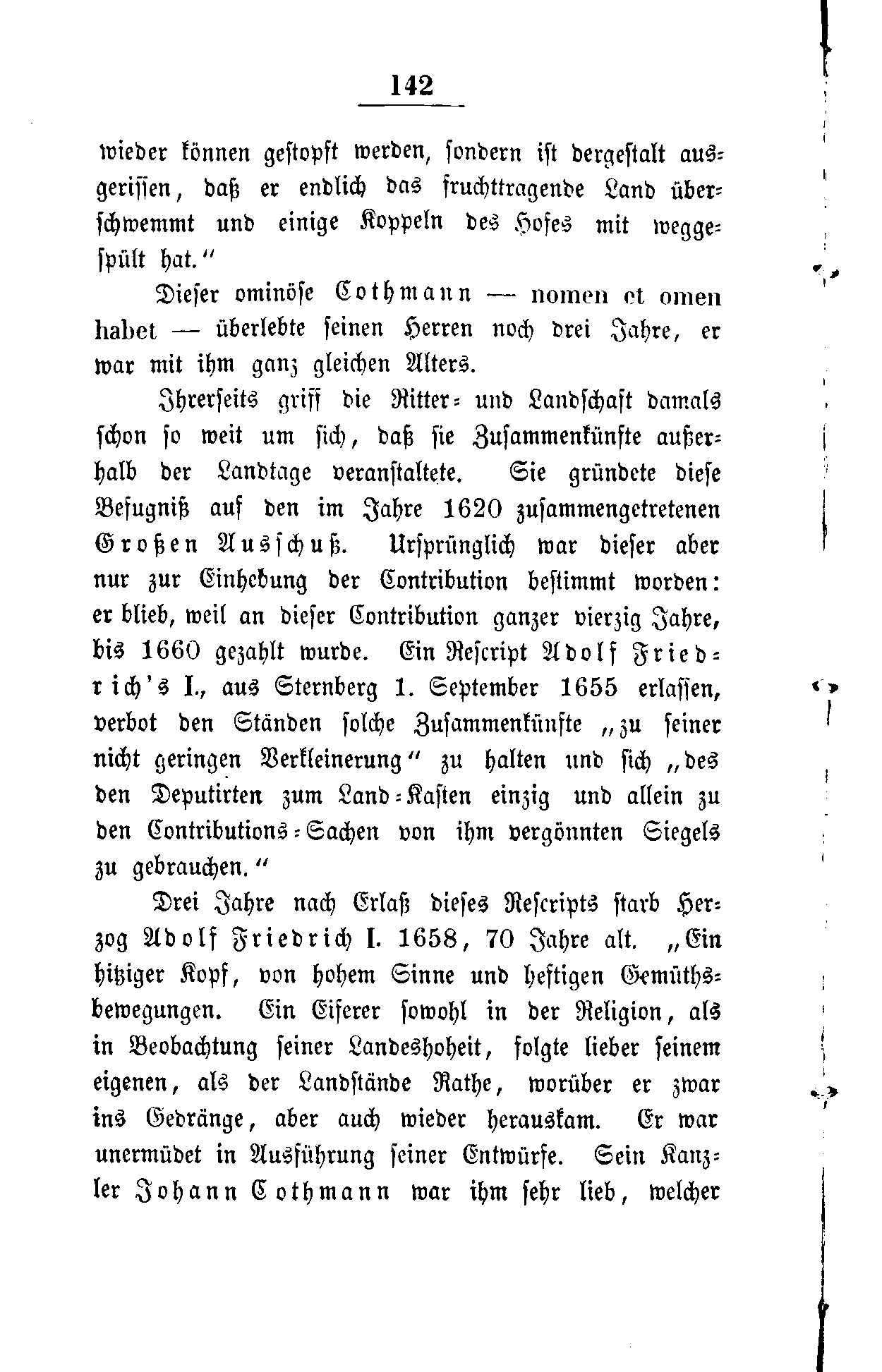 Drei Jahre nach Erlaß dieses Rescripts starb Herzog Adolf Friedrich I. 1658, 70 Jahre alt. „Ein hitziger Kopf, von hohem Sinne und heftigen Gemüthsbewegungen. Ein Eiferer sowohl in der Religion, als in Beobachtung seiner Landeshoheit, folgte lieber seinem eigenen, als der Landstände Rathe, worüber er zwar ins Gedränge, aber auch wieder herauskam. Er war unermüdet in Ausführung seiner Entwürfe. Sein Kanzler Johann Cothmann war ihm sehr lieb, welcher