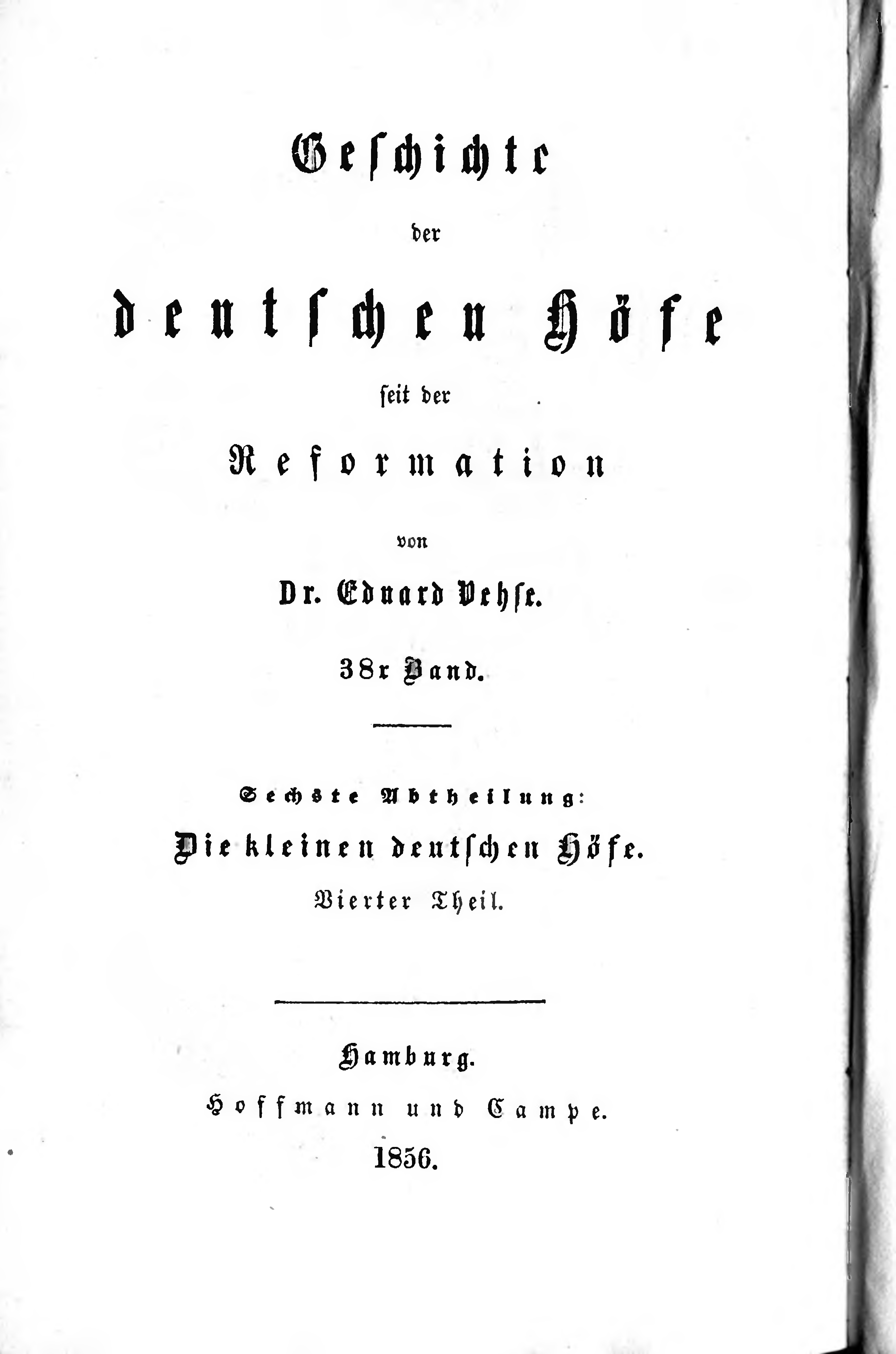 Eduard Vehse: Geschichte der kleinen deutschen Höfe, 4 Teile, Hamburg : Hoffmann und Campe 1856. (= Geschichte der deutschen Höfe seit der Reformation, Band 35–Band 38, Sechste Abtheilung.)