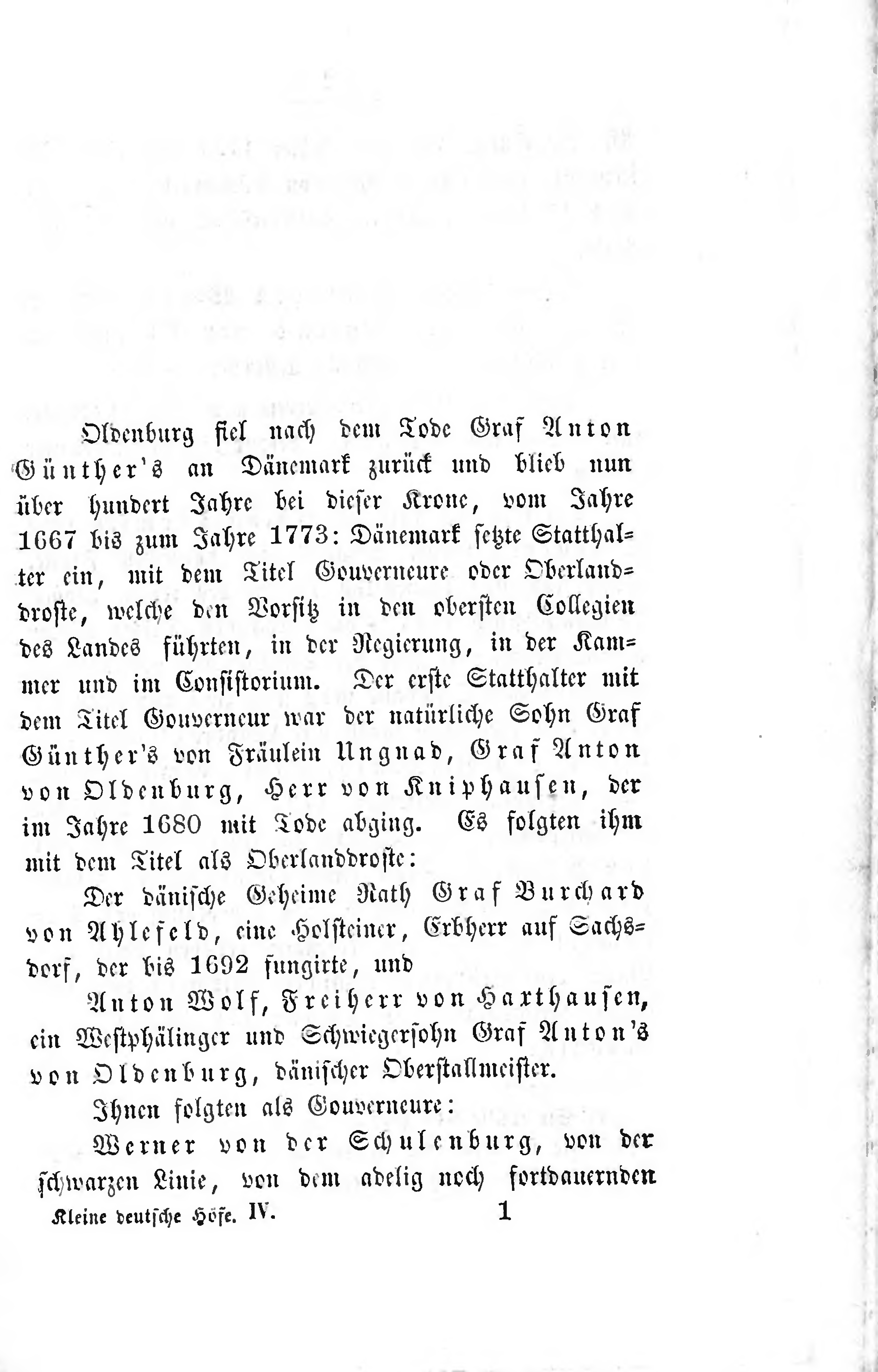 Oldenburg fiel nach dem Tode Graf Anton Günther's an Dänemark zurück und blieb nun über hundert Jahrne bei dieser Krone, vom Jahre 1667 bis zum Jahre 1773: Dänemark setzte Statthalter ein, mit dem Ttel Gouverneure oder Oberlanddroste, welche den Vorsitz in den obersten Collegien des Landes führten, in der Regierung, in der Kammer und im Consistorium. Der erste Statthalter mit dem Titel Gouverneur war der natürliche Sohn Graf Günther's von Fräulein Ungnad, Graf Anton von Oldenburg, Herr von Kniphausen, der im Jahre 1680 mit dem Tode abging. Es folgten ihm mit dem Titel des Oberlanddroster: