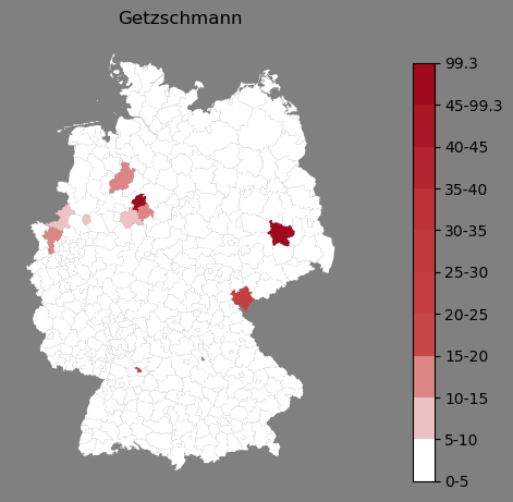 Relative Verteilung des Namens Getzschmann (1996)Direkt zur Karte Die Farbskala zeigt die Anzahl von "Getzschmann" bezogen auf je 1 Million Einträge. |