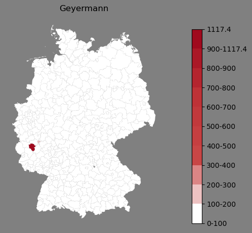 Absolute Verteilung des Namens Geyermann (1890)Direkt zur Karte Absolute Verteilung des Namens "Geyermann" um 1890 im damaligen Deutschen Reich Sie können die Karte innerhalb des Fensters zoomen und verschieben. |