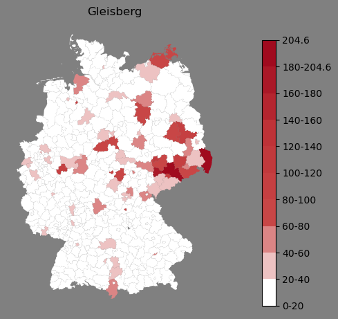 Absolute Verteilung des Namens Gleisberg (1890)Direkt zur Karte Absolute Verteilung des Namens "Gleisberg" um 1890 im damaligen Deutschen Reich Sie können die Karte innerhalb des Fensters zoomen und verschieben. |