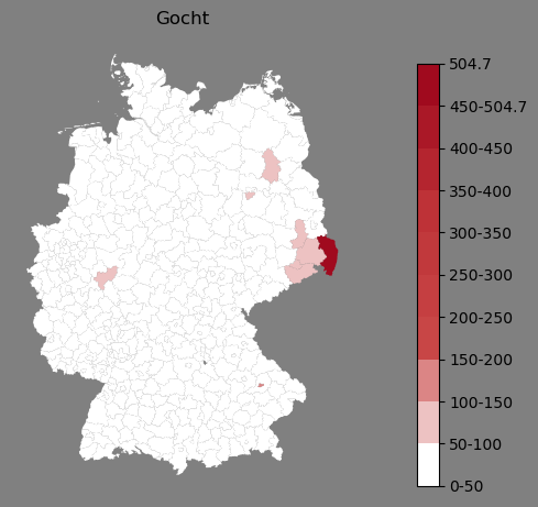 Relative Verteilung des Namens Gocht (1996)Direkt zur Karte Die Farbskala zeigt die Anzahl von "Gocht" bezogen auf je 1 Million Einträge. |