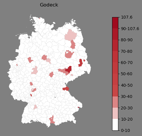 Relative Verteilung des Namens Godeck (1996)Direkt zur Karte Die Farbskala zeigt die Anzahl von "Godeck" bezogen auf je 1 Million Einträge. |