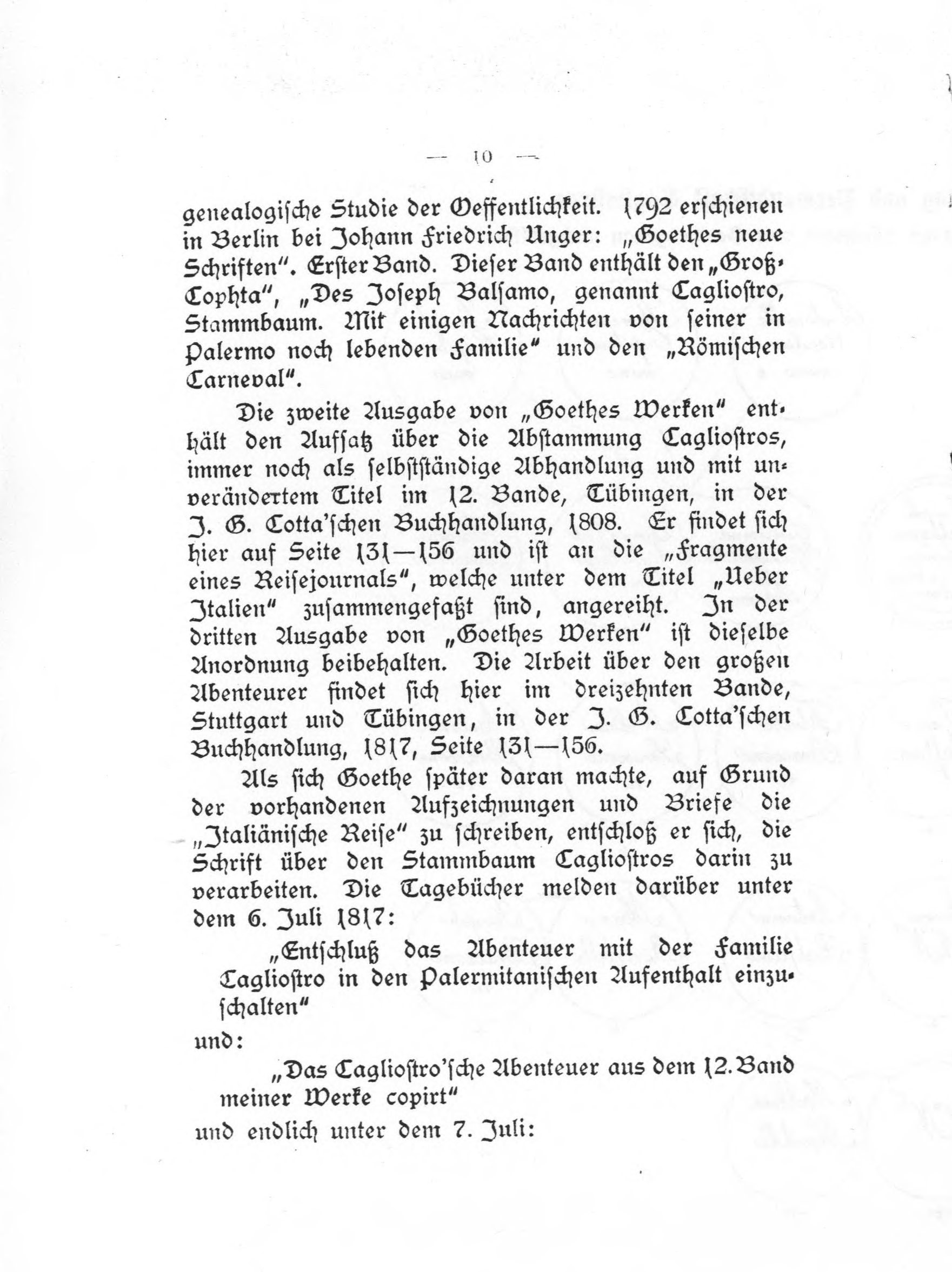 genealogische Studie der Oeffentlichkeit. 1792 erschienen in Berlin bei Johann Friedrich Unger[GWR 1]: „Goethes neue Schriften“. Erster Band. Dieser Band enthält den „Groß-Cophta“, „Des Joseph Balsamo, genannt Cagliostro, Stammbaum. Mit einigen Nachrichten von seiner in Palermo noch lebenden Familie“ und den „Römischen Carneval“.