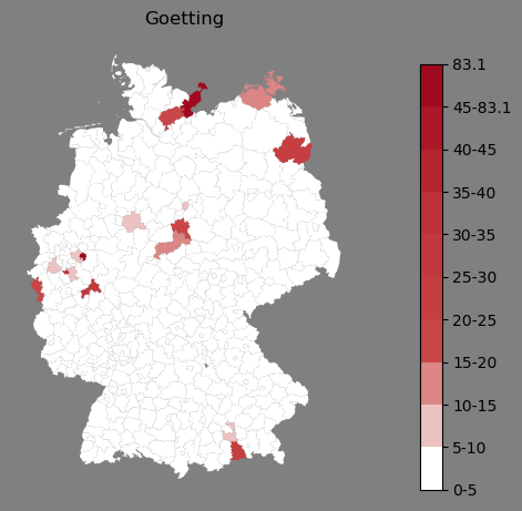Relative Verteilung des Namens Goetting (1996)Direkt zur Karte Die Farbskala zeigt die Anzahl von "Goetting" bezogen auf je 1 Million Einträge. |
