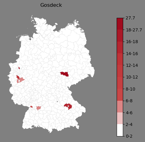 Relative Verteilung des Namens Gosdeck (1996)Direkt zur Karte Die Farbskala zeigt die Anzahl von "Gosdeck" bezogen auf je 1 Million Einträge. |
