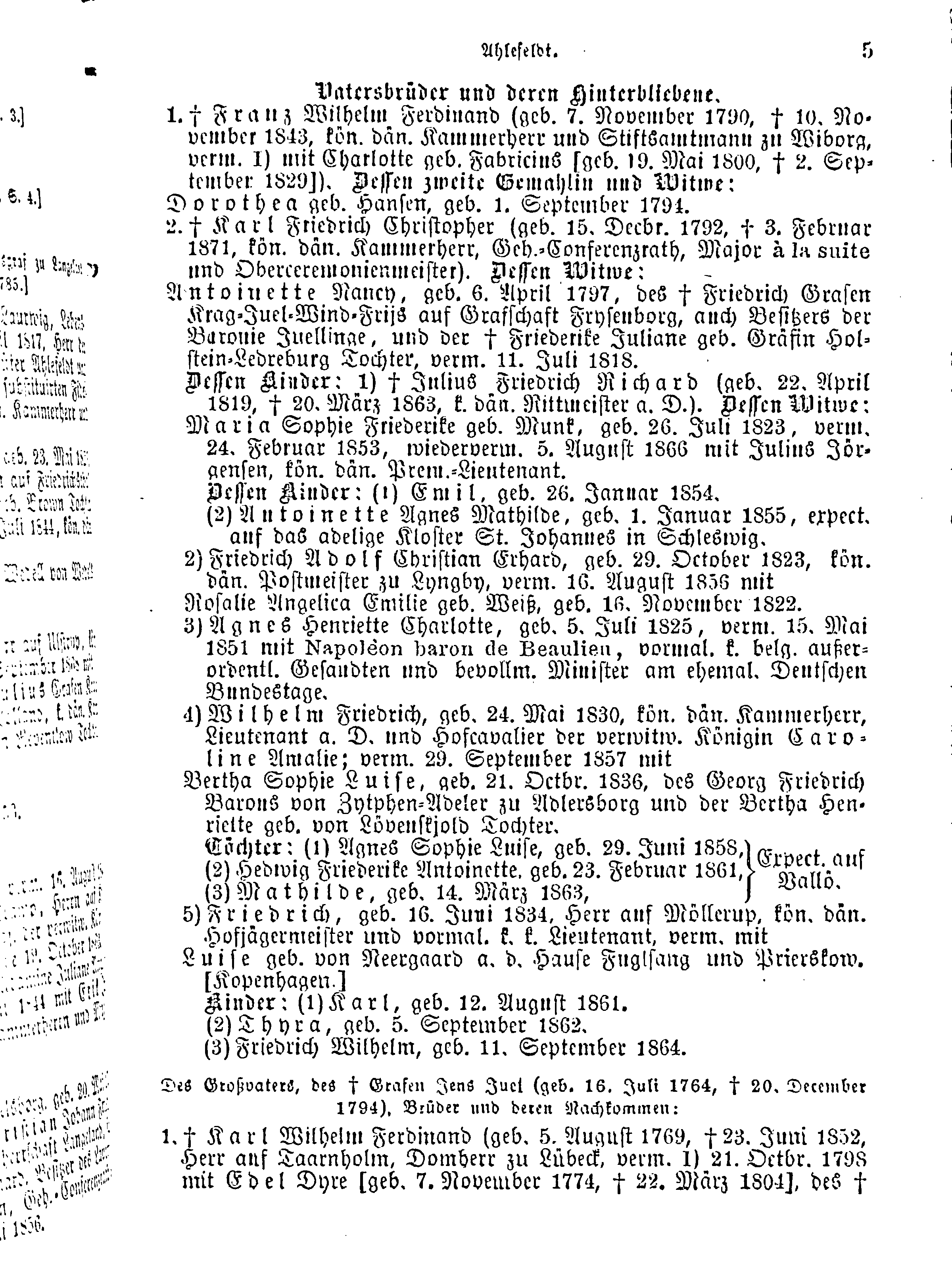 - 5) Friedrich, geb. 16. Juni 1834, Herr auf Möllerup, kön. dän. Hofjägermeister und vormal. k. k. Lieutenant, verm. mit
