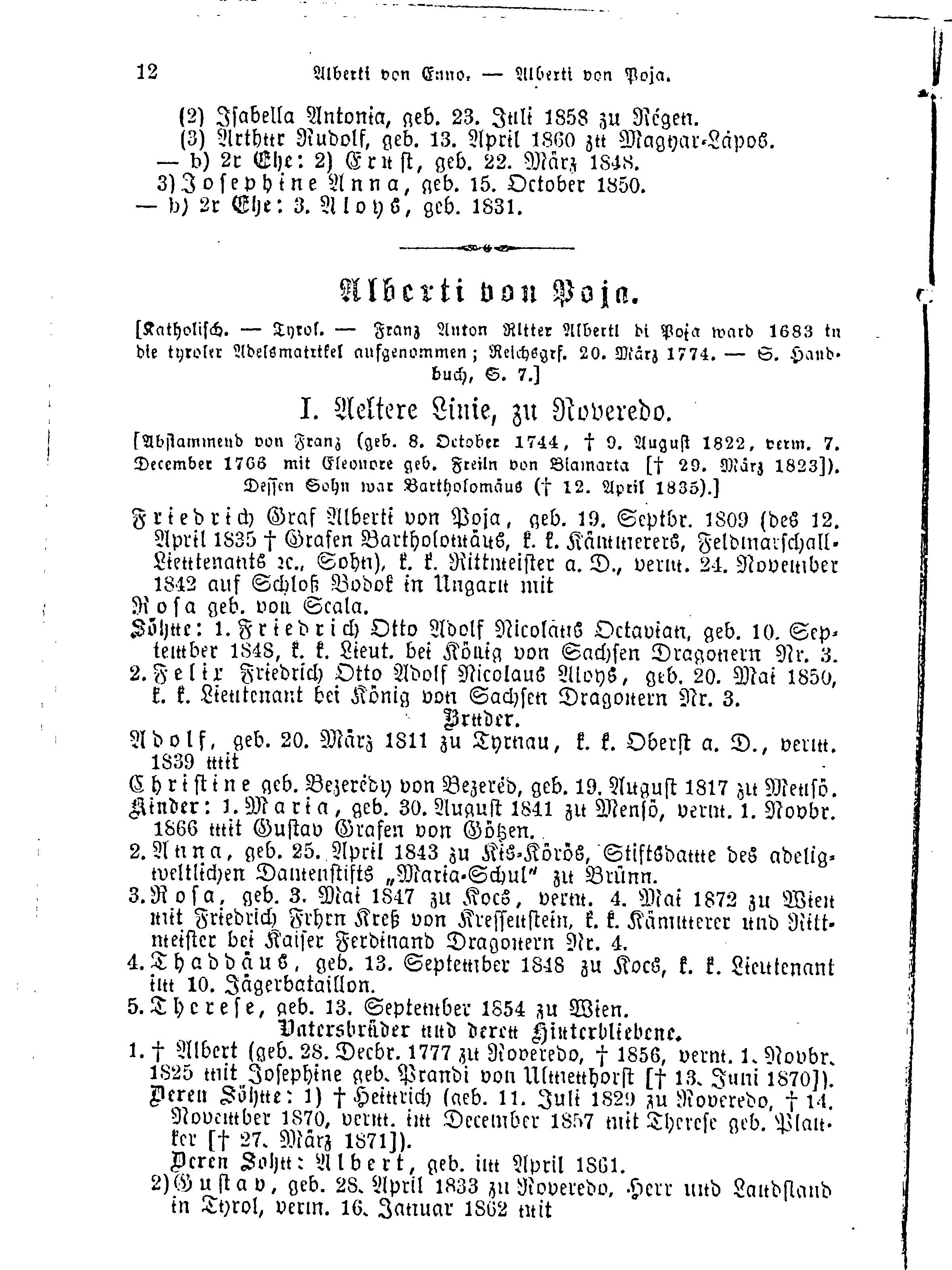 Friedrich Graf Alberti von Poja, geb. 19. Septbr. 1809 (des 12. April 1835 † Grafen Bartholomäus, k. k. Kämmerers, Feldmarschall-Lieutenants ec., Sohn), k. k. Rittmeister a. D., verm. 24. November 1842 auf Schloß Bodok in Ungarn mit