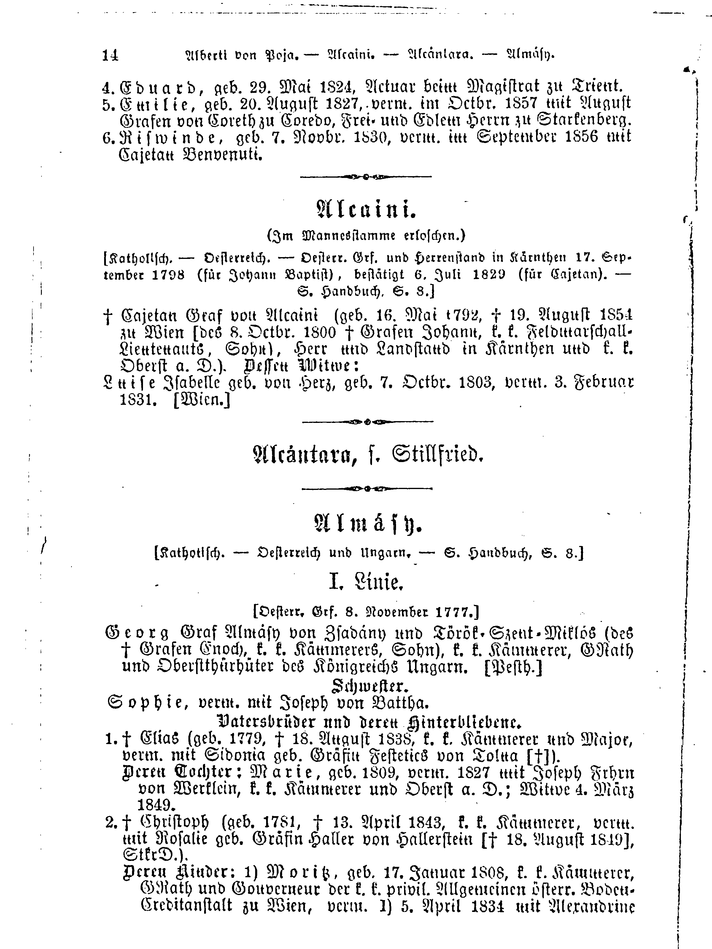 † Cajetan Graf von Alcaini (geb. 16. Mai 1792, † 19. August 1854 zu Wien [des 8. Octbr. 1800 † Grafen Johann, k. k. Feldmarschall-Lieutenants, Sohn), Herr und Landstand in Kärnthen und k. k. Oberst a. D.). Dessen Witwe: