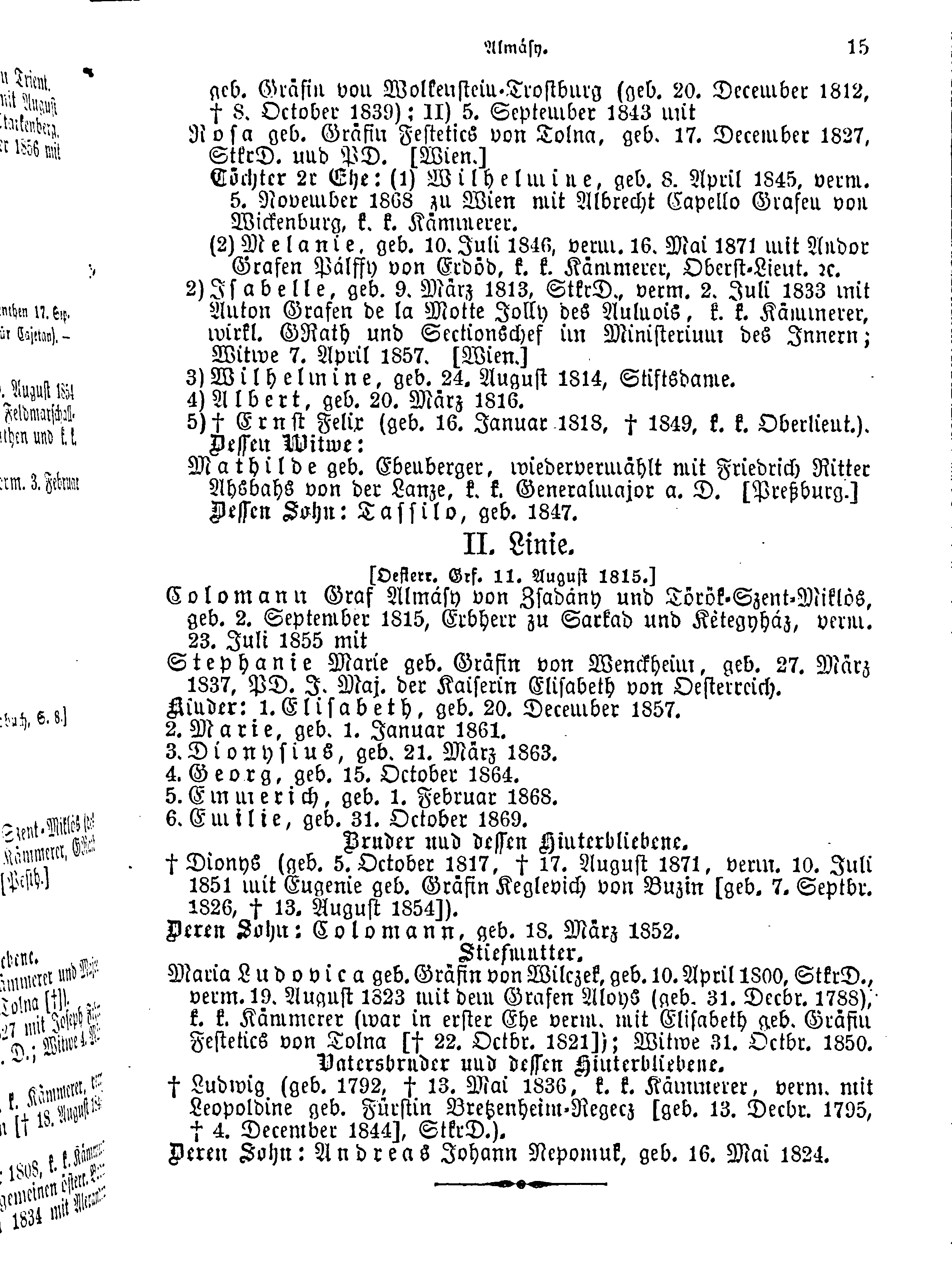 - (2) Melanie, geb. 10. Juli 1846, verm. 16. Mai 1871 mit Andor Grafen Pálffy von Erdöd, k. k. Kämmerer, Oberst-Lieut. ec.