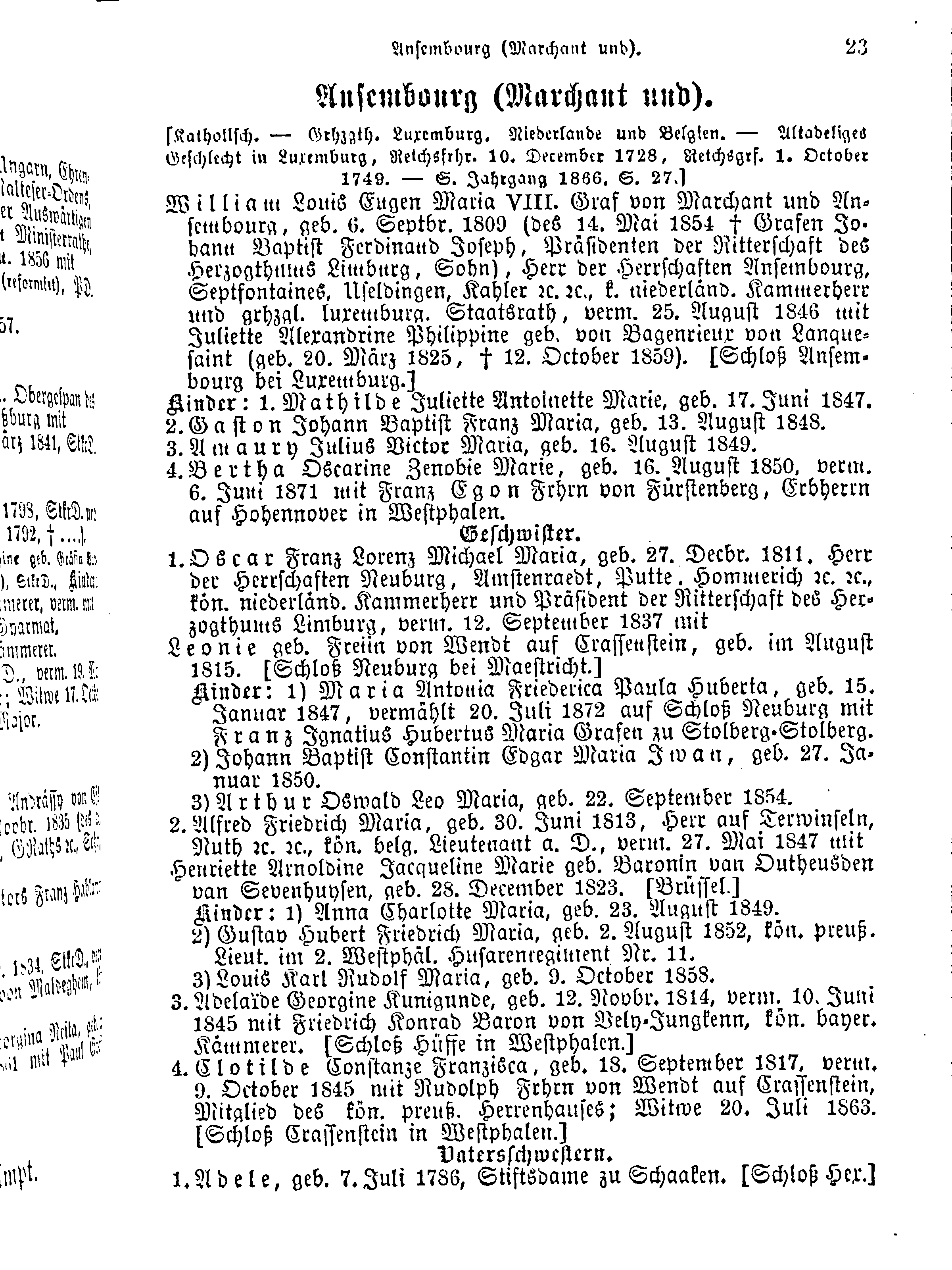 William Louis Eugen Maria VIII. Graf von Marchant und Ansembourg, geb. 6. Septbr. 1809 (des 14. Mai 1854 † Grafen Johann Baptist Ferdinand Joseph, Präsidenten der Ritterschaft des Herzogthums Limburg, Sohn), Herr der Herrschaften Ansembourg, Septfontaines, Useldingen, Kahler ec. ec., k. niederländ. Kammerherr und grhzgl. luxemburg. Staatsrath, verm. 25. August 1846 mit Juliette Alexandrine Philippine geb. von Bagenrieux von Languesaint (geb. 20. März 1825, † 12. October 1859). [Schloß Ansembourg bei Luxemburg.]