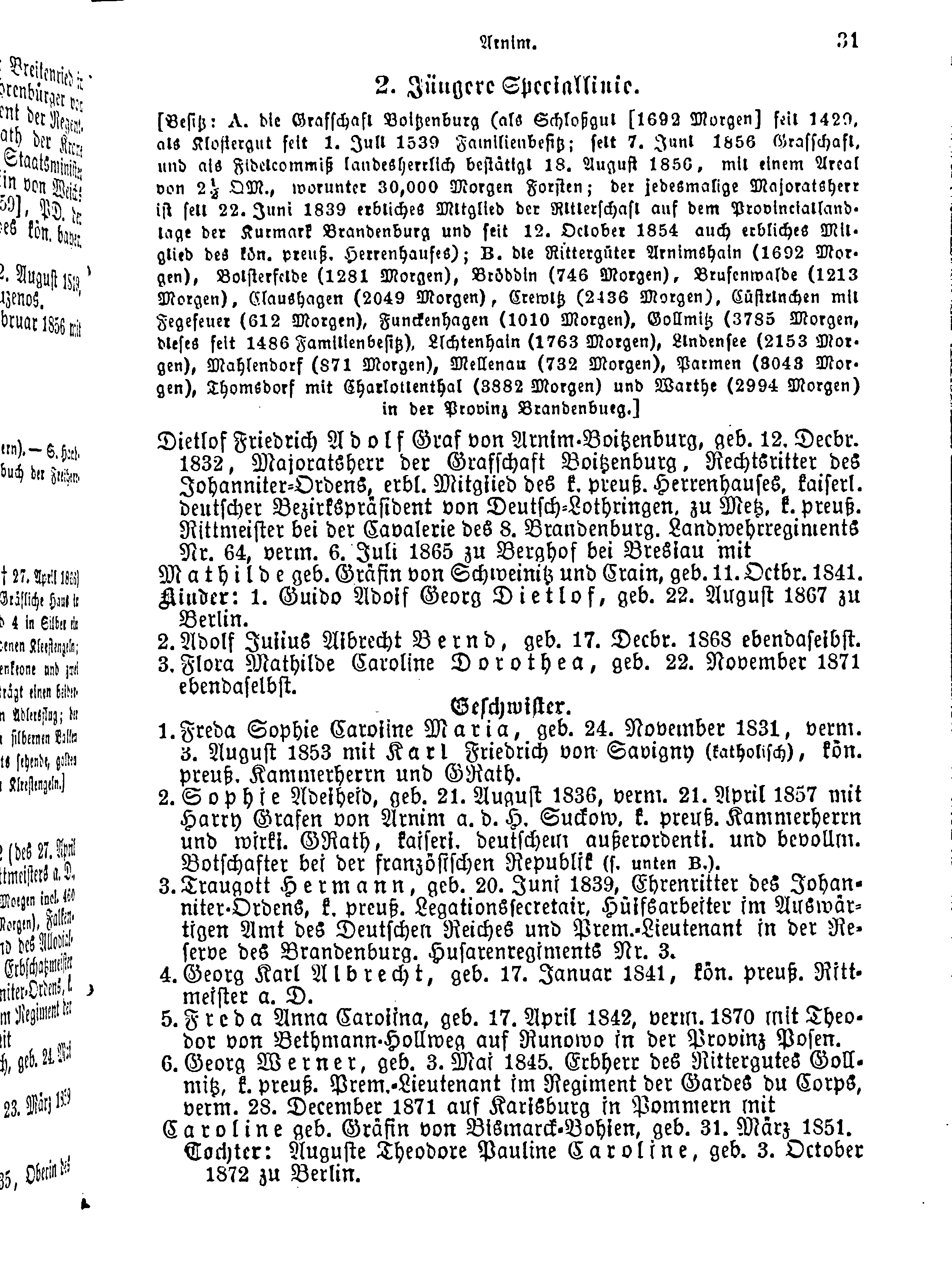 Dietlof Friedrich Adolf Graf von Arnim-Boitzenburg, geb. 12. Decbr. 1832, Majoratsherr der Grafschaft Boitzenburg, Rechtsritter des Johanniter-Ordens, erbl. Mitglied des k. preuß. Herrenhauses, kaiserl. deutscher Bezirkspräsident von Deutsch-Lothringen, zu Metz, k. preuß. Rittmeister bei der Cavalerie des 8. Brandenburg. Landwehrregiments Nr. 64, verm. 6. Juli 1865 zu Berghof bei Breslau mit