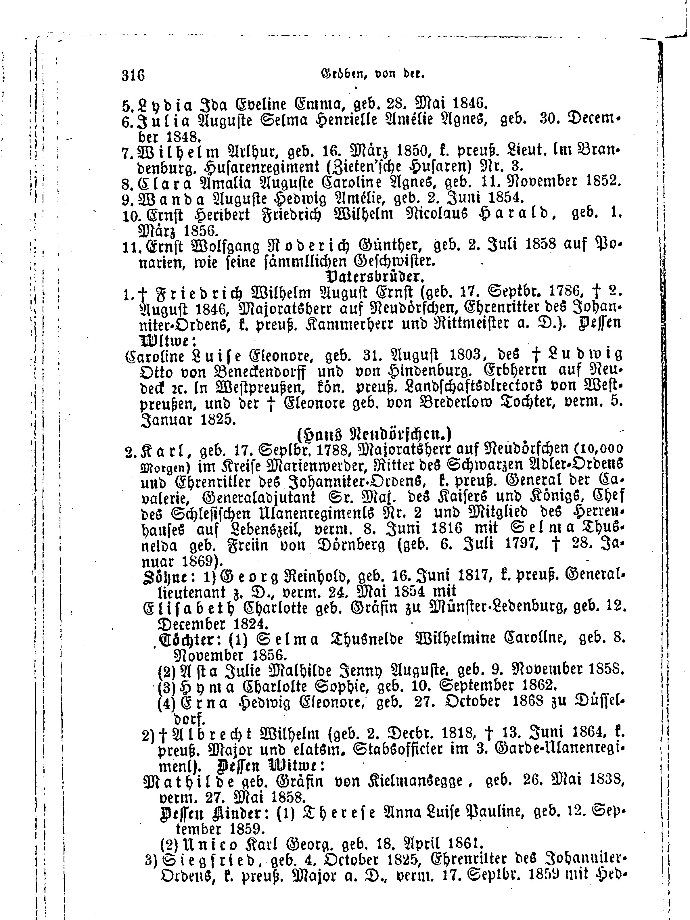 1.+ Friedrich Wilhelm AuguSt Ernft (geb. 17. Septbr. 1786, + 2. AuguSt 1846, MajoratSberr auf Neudörfchen, Ehrenritter des Johan-niter-OrdenS, k. preuss. Kammerherr und Rittmeister a. D.). D*JT*n Witwe: