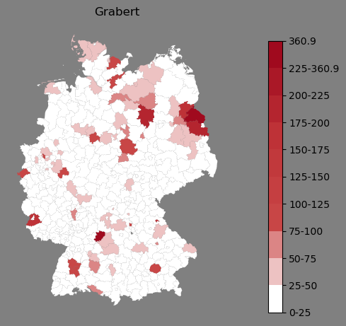 Relative Verteilung des Namens Grabert (1996)Direkt zur Karte Die Farbskala zeigt die Anzahl von "Grabert" bezogen auf je 1 Million Einträge. |