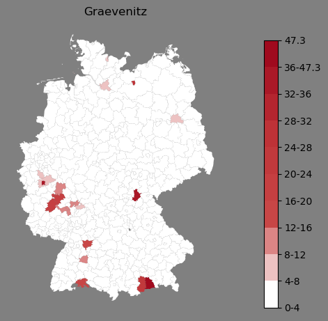 Relative Verteilung des Namens Graevenitz (1996)Direkt zur Karte Die Farbskala zeigt die Anzahl von "Graevenitz" bezogen auf je 1 Million Einträge. |