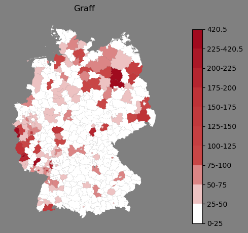 Relative Verteilung des Namens Graff (1996)Direkt zur Karte Die Farbskala zeigt die Anzahl von "Graff" bezogen auf je 1 Million Einträge. |