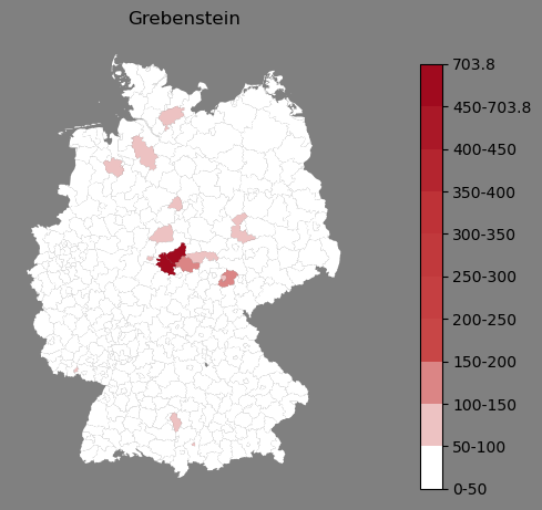 Relative Verteilung des Namens Grebenstein (1996)Direkt zur Karte Die Farbskala zeigt die Anzahl von "Grebenstein" bezogen auf je 1 Million Einträge. |