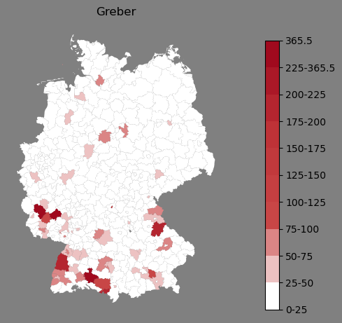 Relative Verteilung des Namens Greber (1996)Direkt zur Karte Die Farbskala zeigt die Anzahl von "Greber" bezogen auf je 1 Million Einträge. |