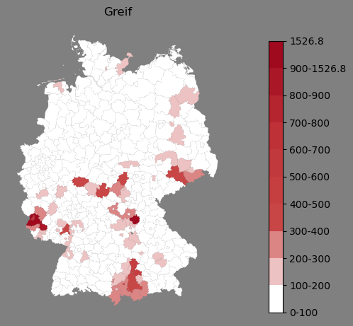 Relative Verteilung des Namens Greif (1996)Direkt zur Karte Die Farbskala zeigt die Anzahl von "Greif" bezogen auf je 1 Million Einträge. |