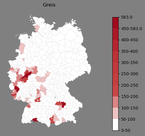 Absolute Verteilung des Namens Greis (1890)Direkt zur Karte Absolute Verteilung des Namens "Greis" um 1890 im damaligen Deutschen Reich Sie können die Karte innerhalb des Fensters zoomen und verschieben. |