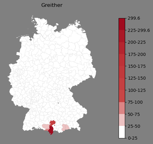 Relative Verteilung des Namens Greither (1996)Direkt zur Karte Die Farbskala zeigt die Anzahl von "Greither" bezogen auf je 1 Million Einträge. |