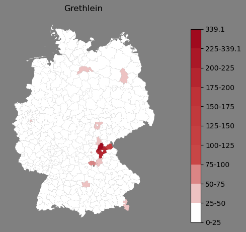 Relative Verteilung des Namens Grethlein (1996)Direkt zur Karte Die Farbskala zeigt die Anzahl von "Grethlein" bezogen auf je 1 Million Einträge. |
