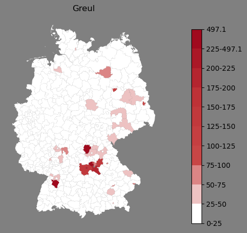 Relative Verteilung des Namens Greul (1996)Direkt zur Karte Die Farbskala zeigt die Anzahl von "Greul" bezogen auf je 1 Million Einträge. |