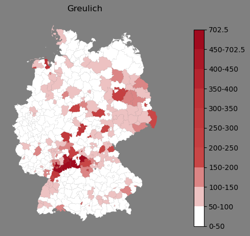 Absolute Verteilung des Namens Greulich (1890)Direkt zur Karte Absolute Verteilung des Namens "Greulich" um 1890 im damaligen Deutschen Reich Sie können die Karte innerhalb des Fensters zoomen und verschieben. |