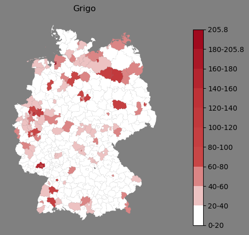 Relative Verteilung des Namens Grigo (1996)Direkt zur Karte Die Farbskala zeigt die Anzahl von "Grigo" bezogen auf je 1 Million Einträge. |