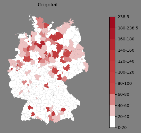 Relative Verteilung des Namens Grigoleit (1996)Direkt zur Karte Die Farbskala zeigt die Anzahl von "Grigoleit" bezogen auf je 1 Million Einträge. |