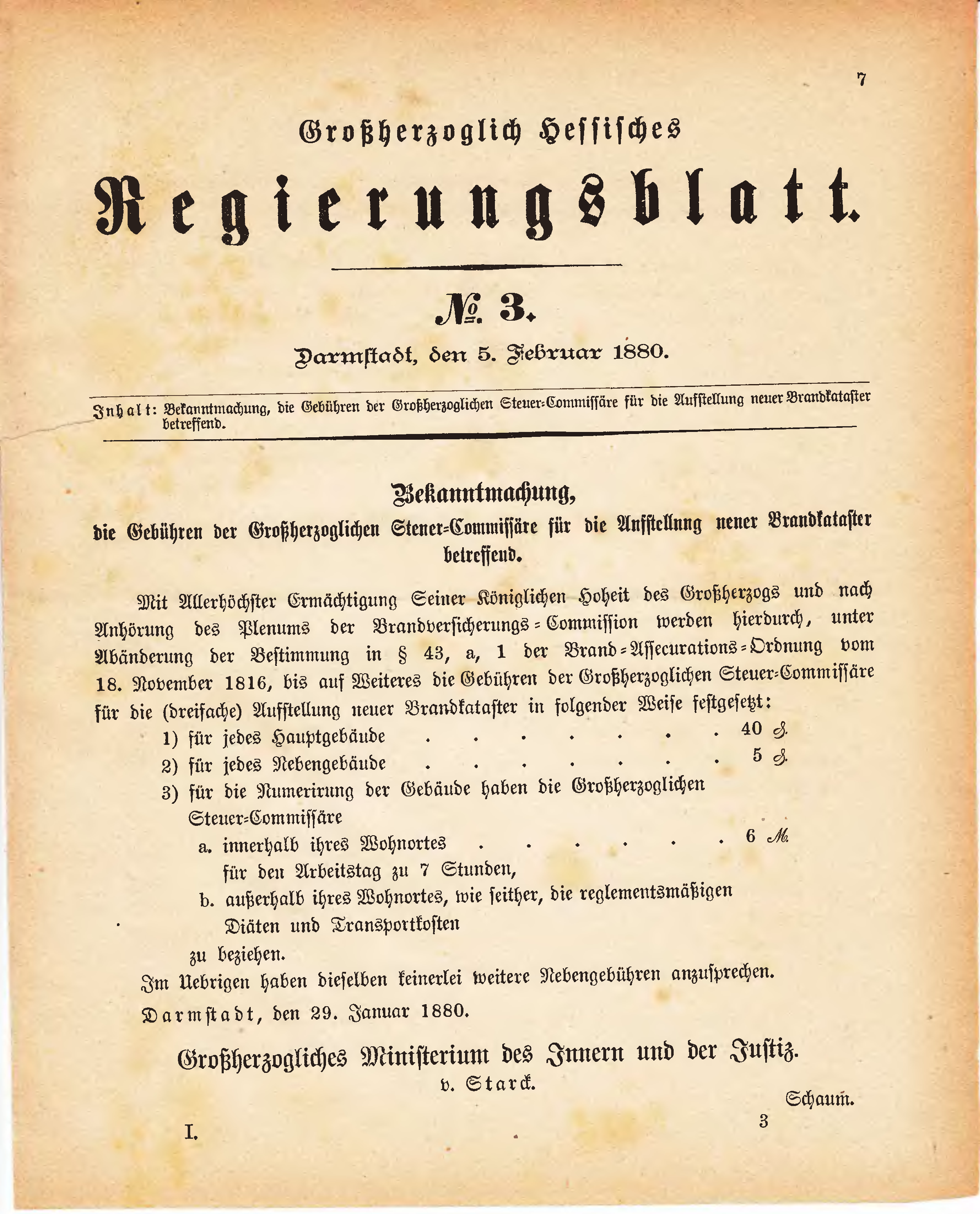 Mit Allerhöchster Ermächtigung Seiner Königlichen Hoheit des Großherzogs und nach Anhörung des Plenums der Brandversicherungs-Commission werden hierdurch, unter Abänderung der Bestimmung in § 43, a, 1 der Brand-Assecurations-Ordnung vom 18. November 1816, bis auf Weiteres die Gebühren der Großherzoglichen Steuer-Commissäre für die (dreifache) Aufstellung neuer Brandkataster in folgender Weise festgesetzt: