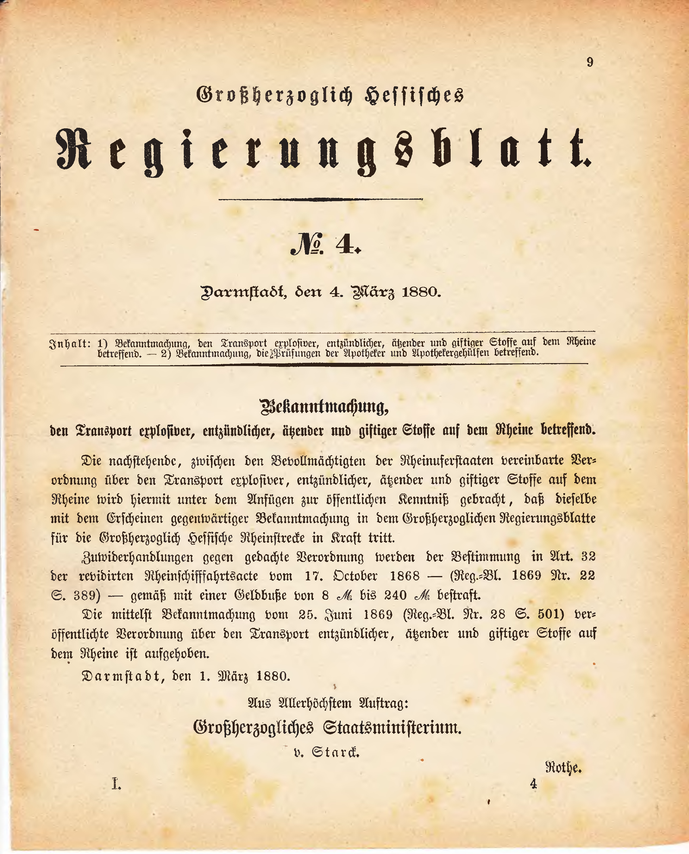 | Inhalt: | 1) Bekanntmachung, den Transport explosiver, entzündlicher, ätzender und giftiger Stoffe auf dem Rheine betreffend. - 2) Bekanntmachung, die Prüfungen der Apotheker und Apothekergehülfen betreffend. |