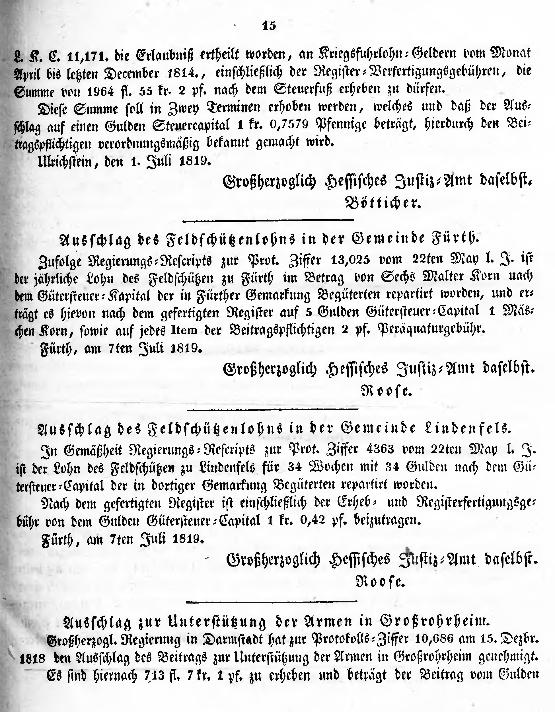 In Gemäßheit Regierungs-Rescripts zur Prot. Ziffer 4363 vom 22ten May l. J. ist der Lohn des Feldschützen zu Lindenfels für 34 Wochen mit 34 Gulden nach dem Gütersteuer-Capital der in dortiger Gemarkung Begüterten repartirt worden.