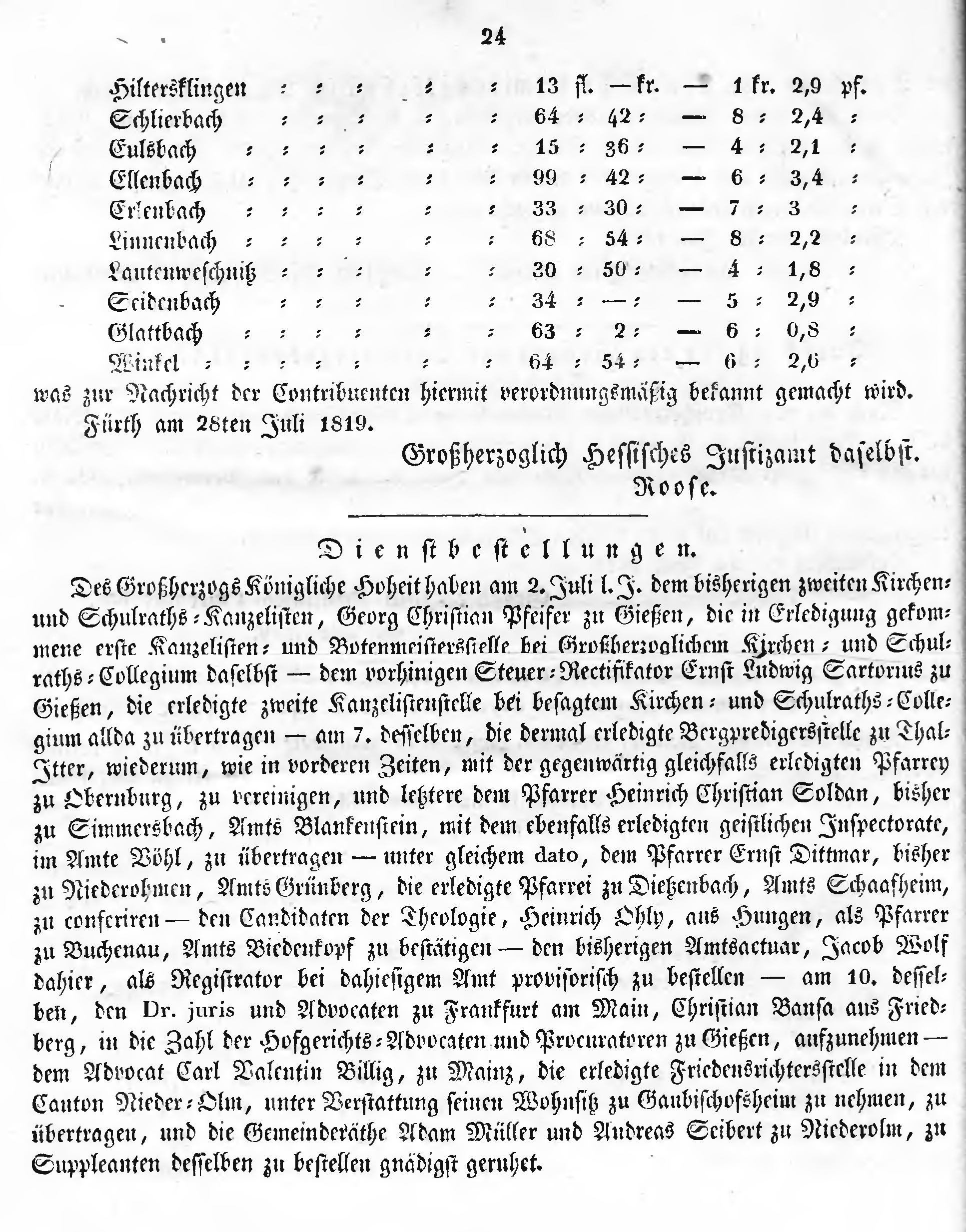 Des Großherzogs Königliche Hoheit haben am 2. Juli l.J. dem bisherigen zweiten Kirchen- und Schulraths-Kanzelisten, Georg Christian Pfeifer zu Gießen, die in Erledigung gekommene erste Kanzelisten- und Botenmeistersstelle bei Großherzoglichem Kirchen- und Schulraths-Collegium daselbst - dem vorhinigen Steuer-Rectifikator Ernst Ludwig Sartorius zu Gießen, die erledigte zweite Kanzelistenstelle bei besagtem Kirchen- und Schulraths-Collegium allda zu übertragen - am 7. desselben, die dermal erledigte Bergpredigersstelle zu Thal-Itter, wiederum, wie in vorderen Zeiten, mit der gegenwärtig gleichfalls erledigten Pfarrey zu Obernburg, zu vereinigen, und letztere dem Pfarrer Heinrich Christian Soldan, bisher zu Simmersbach, Amts Blankenstein, mit dem ebenfalls erledigten geistlichen Inspectorate, im Amte Bühl, zu übertragen - unter gleichem dato, dem Pfarrer Ernst Dittmar, bisher zu Niederohmen, Amts Grünberg, die erledigte Pfarrei zu Dietzenbach, Amts Schaafheim, zu conferiren - den Candidaten der Theologie, Heinrich Ohly, aus Hungen, als Pfarrer zu Buchenau, Amts Biedenkopf zu bestätigen - den bisherigen Amtsactuar, Jacob Wolf dahier, als Registrator bei dahiesigem Amt provisorisch zu bestellen - am 10. desselben, den Dr. juris und Advocaten zu Frankfurt am Main, Christian Bansa aus Friedberg, in die Zahl der Hofgerichts-Advocaten und Procuratoren zu Gießen, aufzunehmen - dem Advocat Carl Valentin Billig, zu Mainz, die erledigte Friedensrichtersstelle in dem Canton Nieder-Olm, unter Verstattung seinen Wohnsitz zu Gaubischofsheim zu nehmen, zu übertragen, und die Gemeinderäthe Adam Müller und Andreas Seibert zu Niederolm, zu Suppleanten desselben zu bestellen gnädigst geruhet.