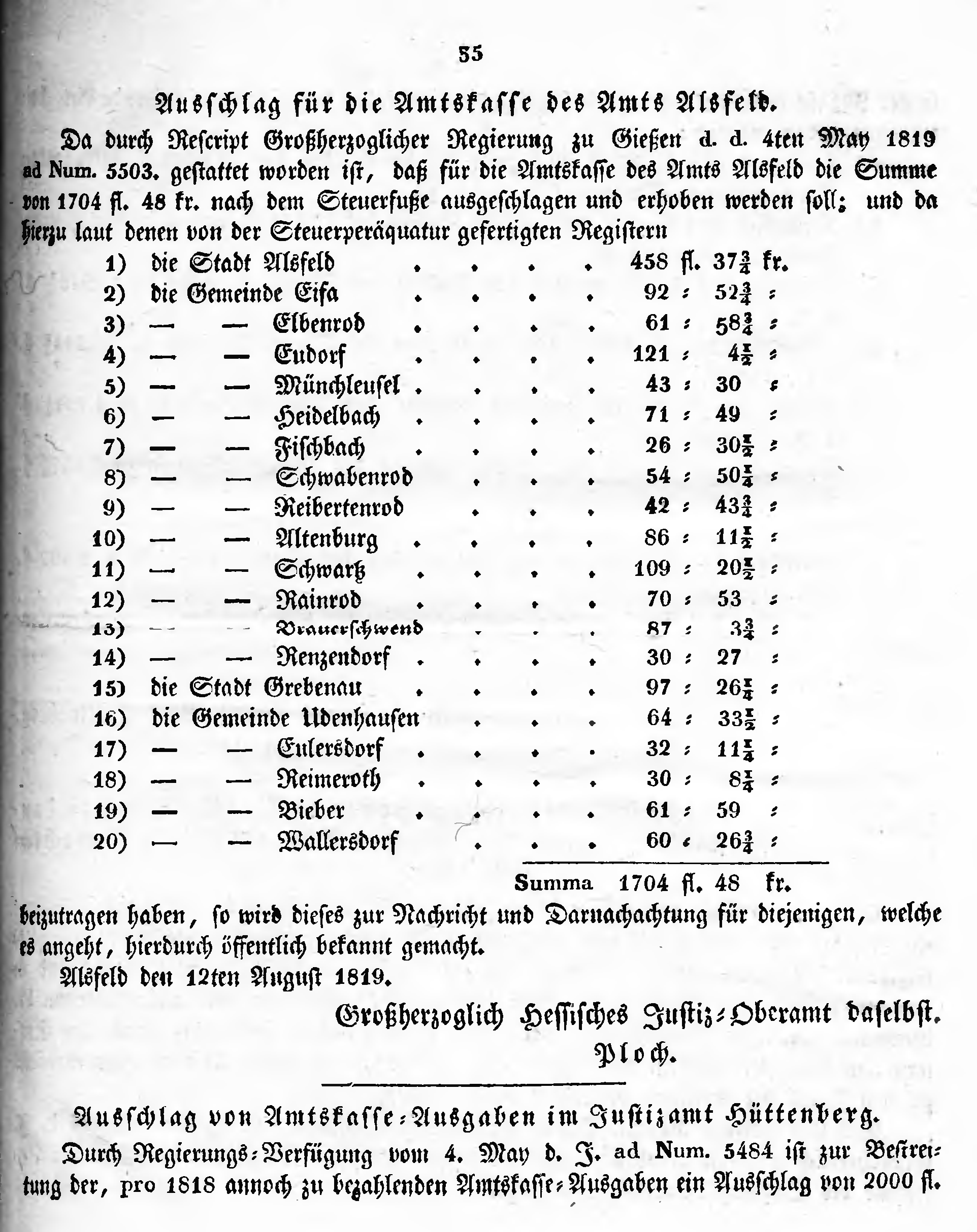 Da durch Rescript Großherzoglicher Regierung zu Gießen d. d. 4ten May 1819 ad Num. 5503. gestattet worden ist, daß für die Amtskasse des Amts Alsfeld die Summe von 1704 fl. 48 kr. nach dem Steuerfuße ausgeschlagen und erhoben werden soll; und da hierzu laut denen von der Steuerperäquatur gefertigten Registern