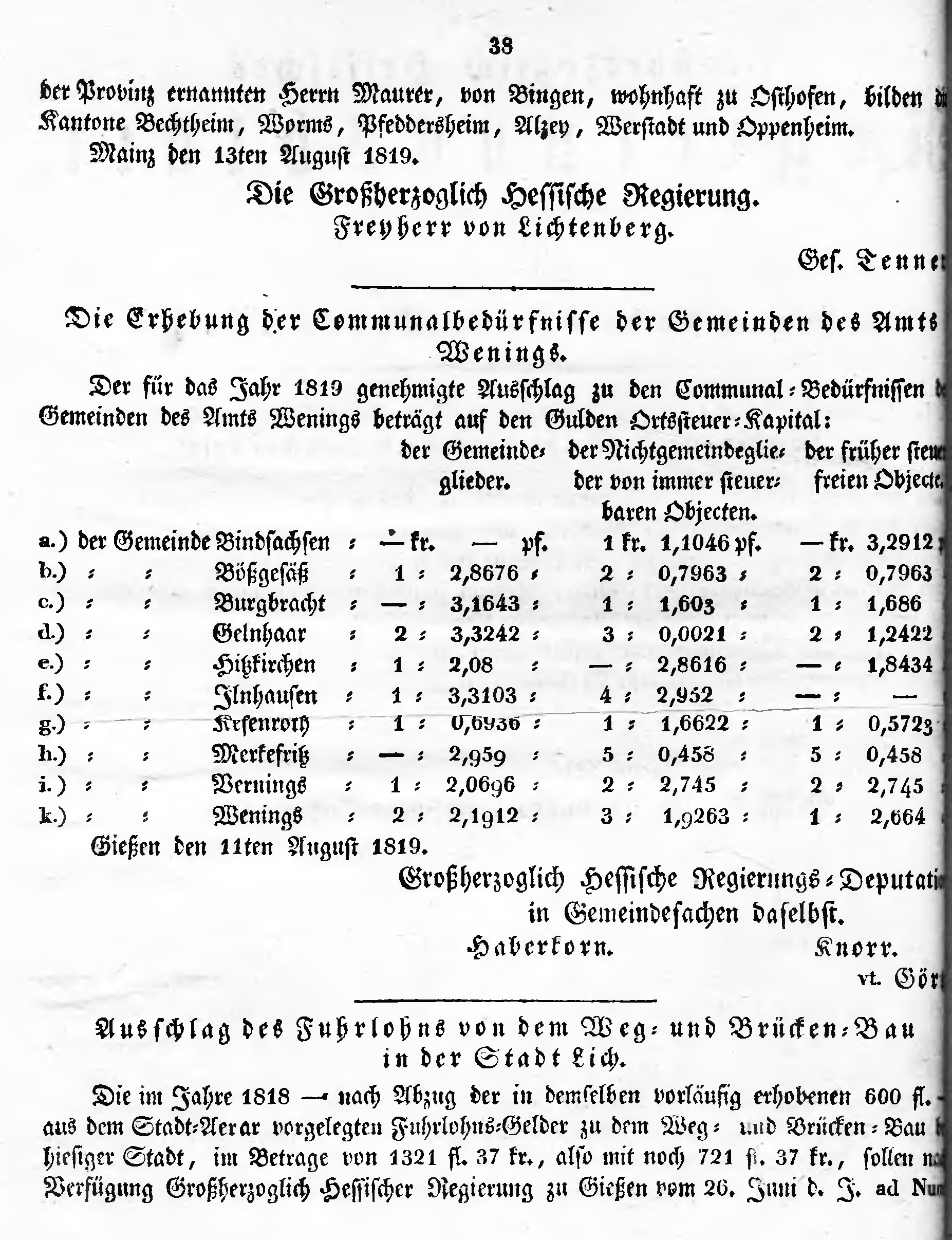 Der für das Jahr 1819 genehmigte Ausschlag zu den Communal-Bedürfnissen der Gemeinden des Amts Wenings beträgt auf den Gulden Ortssteuer-Kapital: