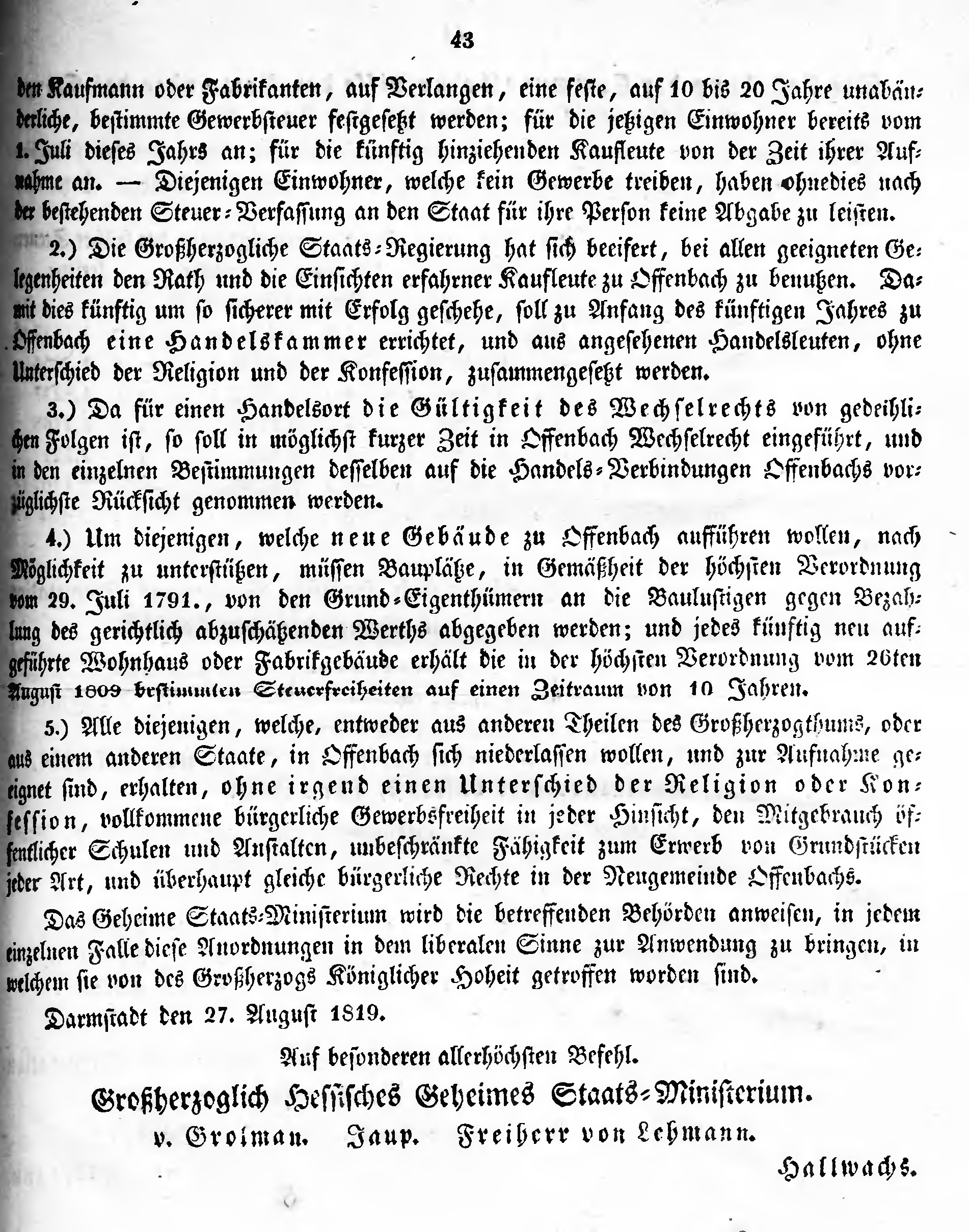 5.) Alle diejenigen, welche, entweder aus anderen Theilen des Großherzogthums, oder aus einem anderen Staate, in Offenbach sich niederlassen wollen, und zur Aufnahme geeignet sind, erhalten, ohne irgend einen Unterschied der Religion oder Konfession, vollkommene bürgerliche Gewerbsfreiheit in jeder Hinsicht, den Mitgebrauch öffentlicher Schulen und Anstalten, unbeschränkte Fähigkeit zum Erwerb von Grundstücken jeder Art, und überhaupt gleiche bürgerliche Rechte in der Neugemeinde Offenbachs.