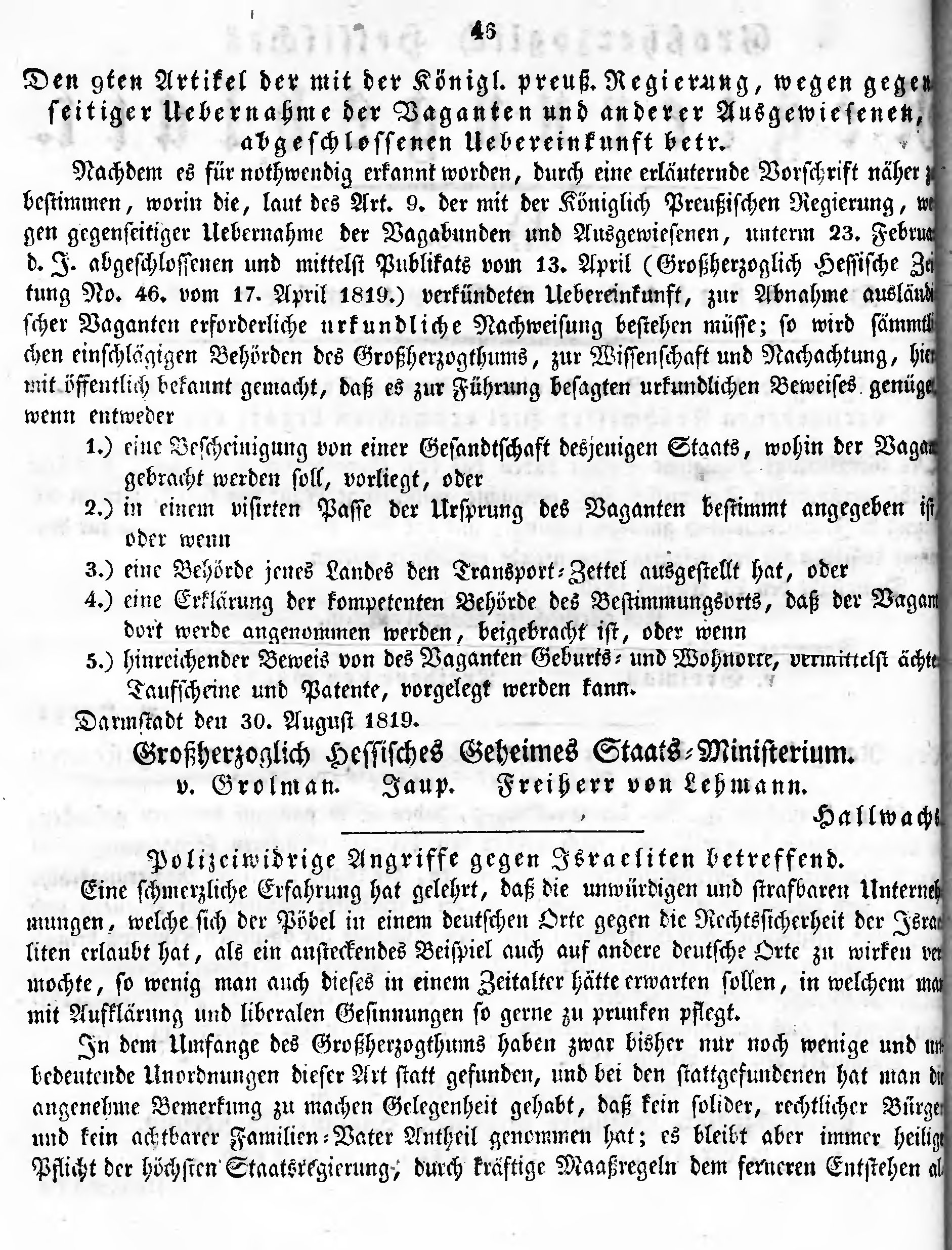 5.) hinreichender Beweis von des Vaganten Geburts- und Wohnorte, vermittelst ächte Taufscheine und Patente, vorgelegt werden kann. - Darmstadt den 30. August 1819.
