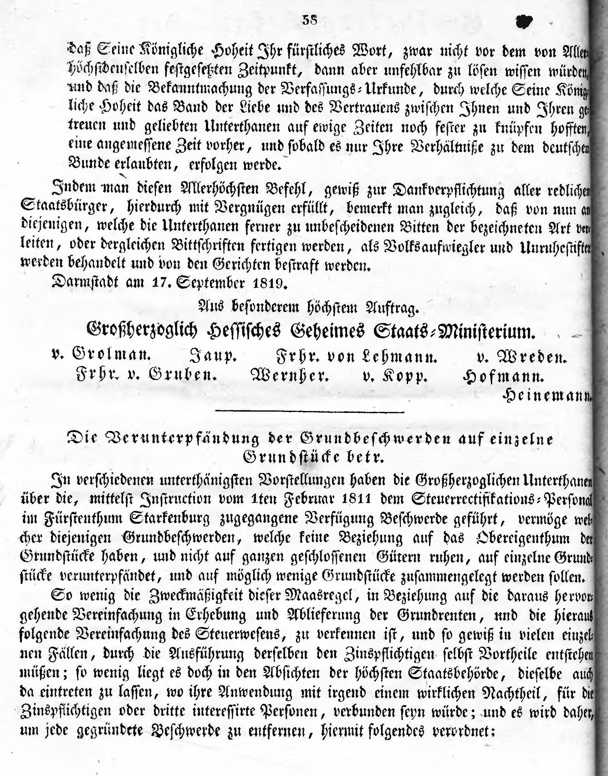In verschiedenen unterthänigsten Vorstellungen haben die Großherzoglichen Unterthanen über die, mittelst Instruction vom 1ten Februar 1811 dem Steuerrectifikations-Personal im Fürstenthum Starkenburg zugegangene Verfügung Beschwerde geführt, vermöge welcher diejenigen Grundbeschwerden, welche keine Beziehung auf das Obereigenthum der Grundstücke haben, und nicht aus ganzen geschlossenen Gütern ruhen, auf einzelne Grundstücke verunterpfändet, und auf möglich wenige Grundstücke zusammengelegt werden sollen.