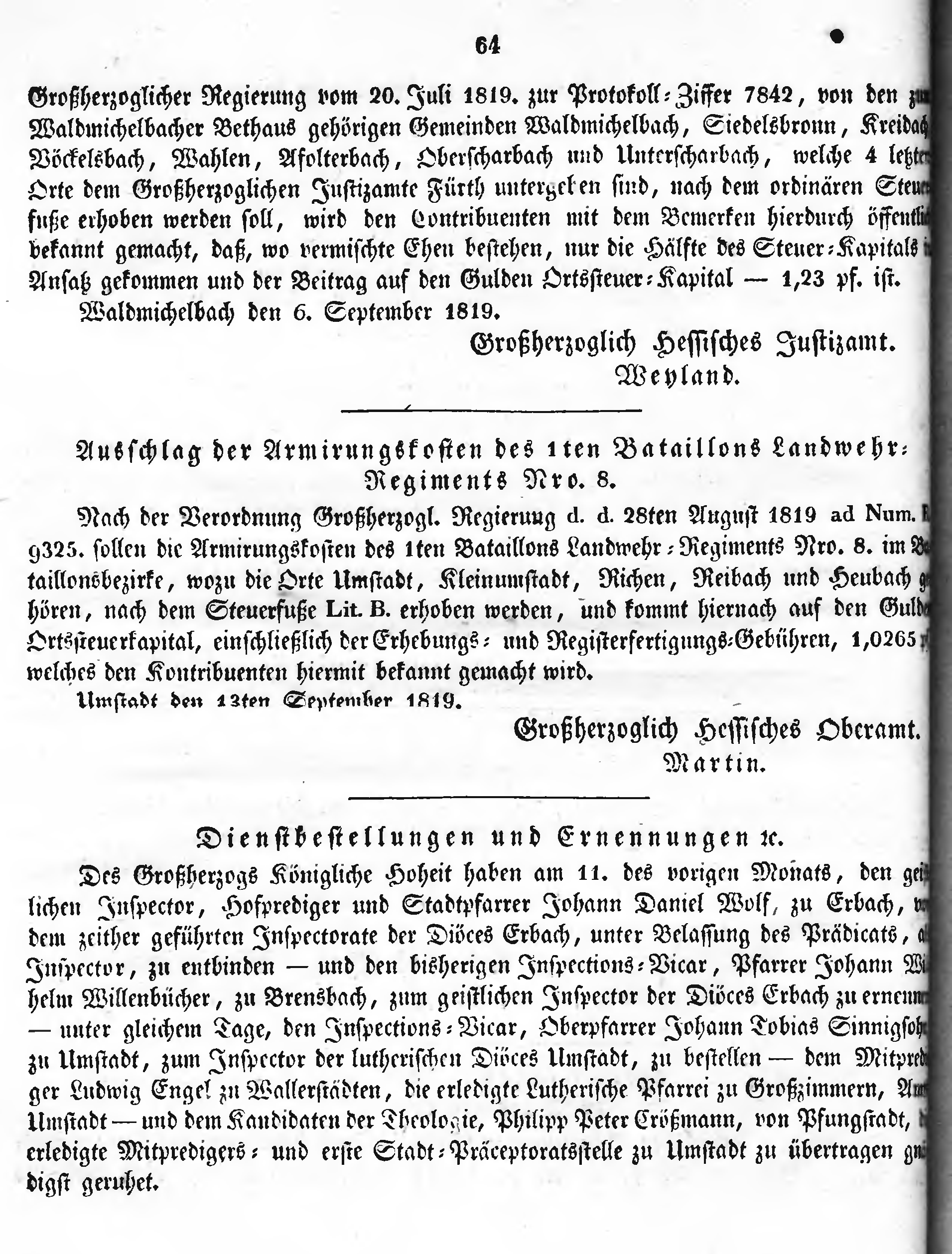 Des Großherzogs Königliche Hoheit haben am 11. des vorigen Monats, den geistlichen Inspector, Hofprediger und Stadtpfarrer Johann Daniel Wolf, zu Erbach, von dem zeither geführten Inspectorate der Diöces Erbach, unter Belassung des Prädicats, als Inspector, zu entbinden - und den bisherigen Inspections-Vicar, Pfarrer Johann Wilhelm Willenbücher, zu Brensbach, zum geistlichen Inspector der Diöces Erbach zu ernennen - unter gleichem Tage, den Inspections-Vicar, Oberpfarrer Johann Tobias Sinnigsohn zu Umstadt, zum Inspector der lutherischen Diöces Umstadt, zu bestellen - dem Mitprediger Ludwig Engel zu Wallerstädten, die erledigte Lutherische Pfarrei zu Großzimmern, Amts Umstadt - und dem Kandidaten der Theologie, Philipp Peter Crößmann, von Pfungstadt, die erledigte Mitpredigers- und erste Stadt-Präceptoratsstelle zu Umstadt zu übertragen gnädigst geruhet.