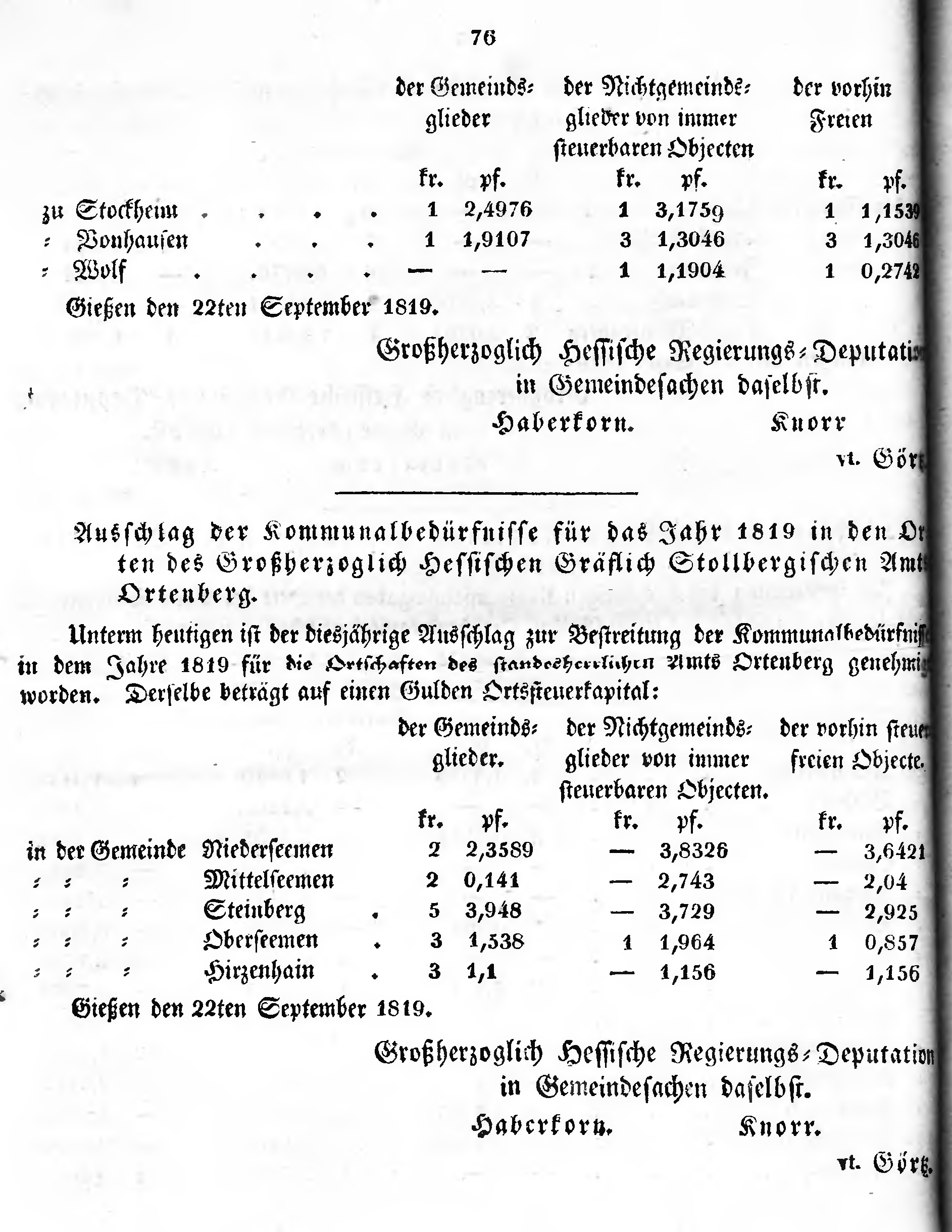 Unterm heutigen ist der diesjährige Ausschlag zur Bestreitung der Kommunalbedürfnisse in dem Jahre 1819 für die Ortschaften des standesherrlichen Amts Ortenberg genehmigt worden. Derselbe beträgt auf einen Gulden Ortssteuerkapital: