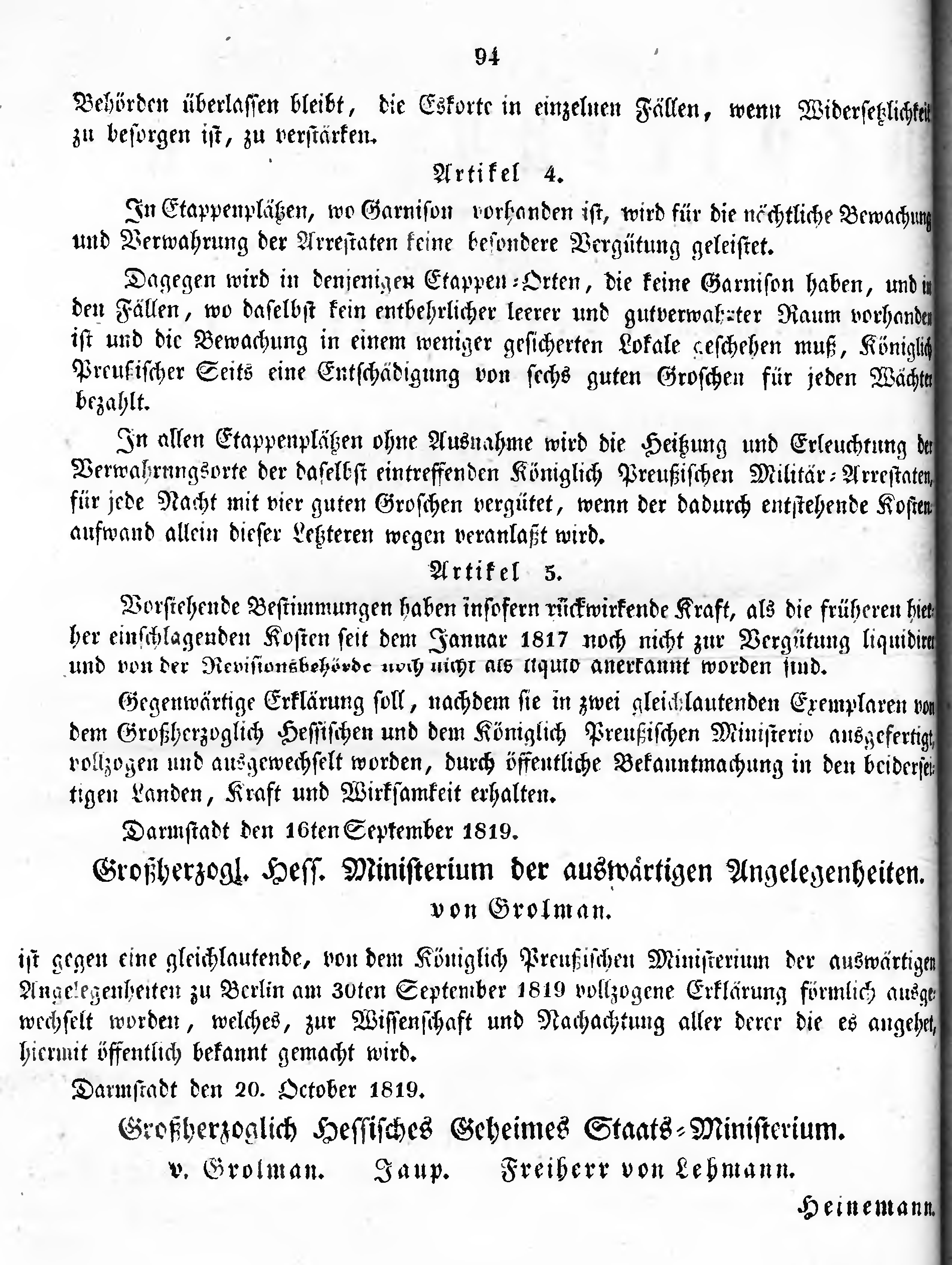 Gegenwärtige Erklärung soll, nachdem sie in zwei gleichlautenden Exemplaren von dem Großherzoglich Hessischen und dem Königlich Preußischen Ministerio ausgefertigt, vollzogen und ausgewechselt worden, durch öffentliche Bekanntmachung in den beiderseitigen Landen, Kraft und Wirksamkeit erhalten.- Darmstadt den 16ten September 1819.